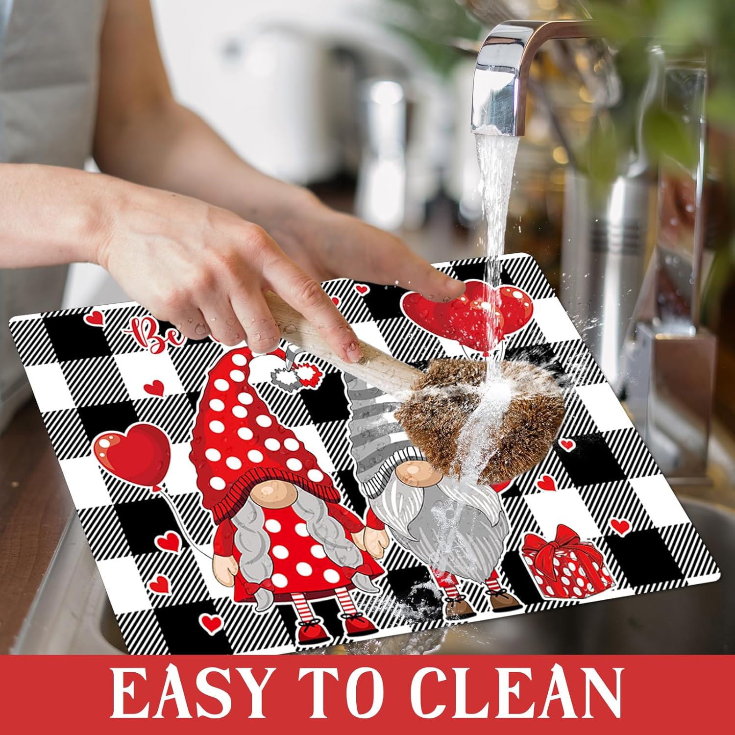 Valentine's Day Placemats Set of 6 Gnomes Plastic Table Mats Buffalo Plaid Place Mats Washable Vinyl Love Hearts Table Decoration for Anniversary Wedding Party Kitchen Dining Table