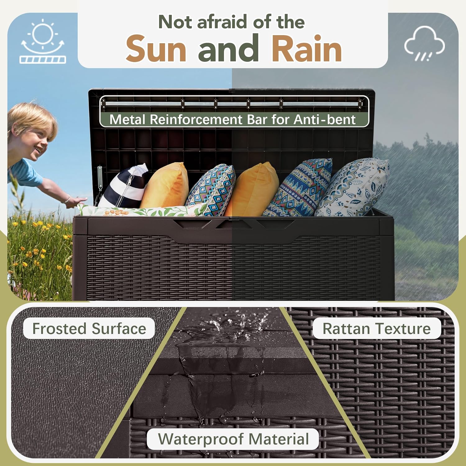 - [All-Weather Material] Deck box is made of premium Resin, featured with waterproof and UV resistant which protects its exterior from fading and keeps its interior dry. Suitable for long time outdoor using