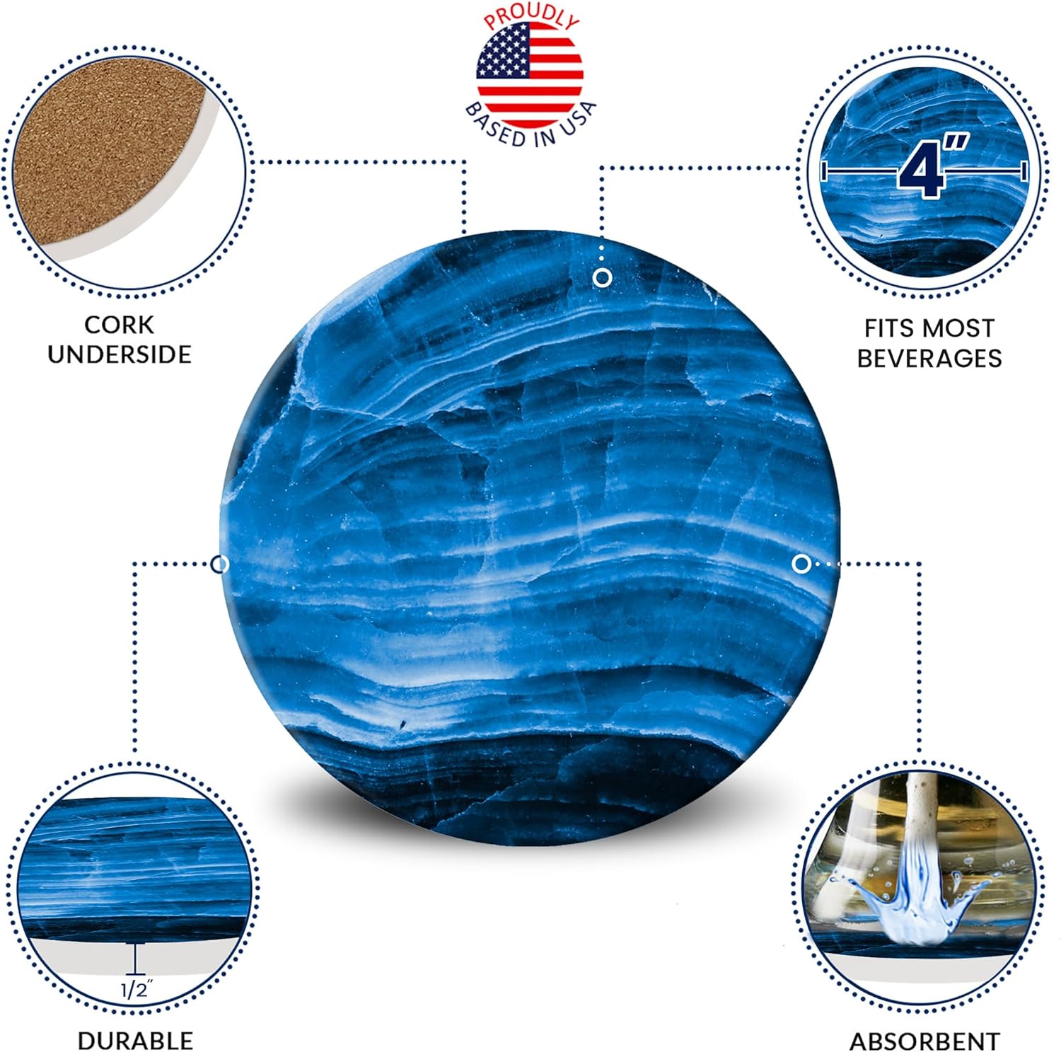 - FULL COMPREHENSIVE PROTECTION: The stone coasters feature non-slip durable cork backing to protect countertops and desks from scratches even from thirsty drinkers! The non-sticky corked backing base helps the coasters stay in place and prevents scratching your glass or wooden countertop tables.