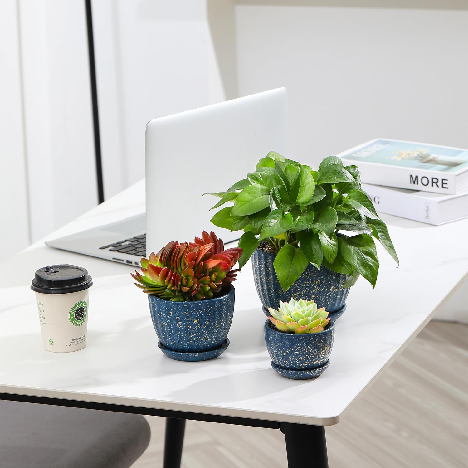 - SMALL PLANTER SET: These garden plant pots are made of ceramic and come in three sizes: Medium width is 5.5 inches (14 cm), Small width is 4.3 (11 cm) inches, and nimi width is 3.3 inches (9 cm). They are fired at high temperature, so they are durable and lightweight..