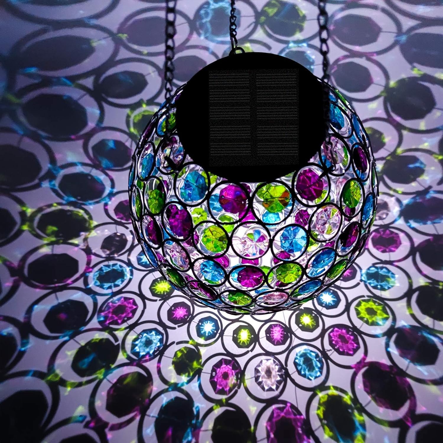 - 【Hand-made Lantern】Dia 7.5 inch solar lantern is designed with hollowed-out pattern, it beams attractive and beautiful light throughout the orb in the night. During the day, the solar lantern sparkles in the sunlight by these polygonal acrylic pieces. Metal frame makes this decorative lantern more sturdy.