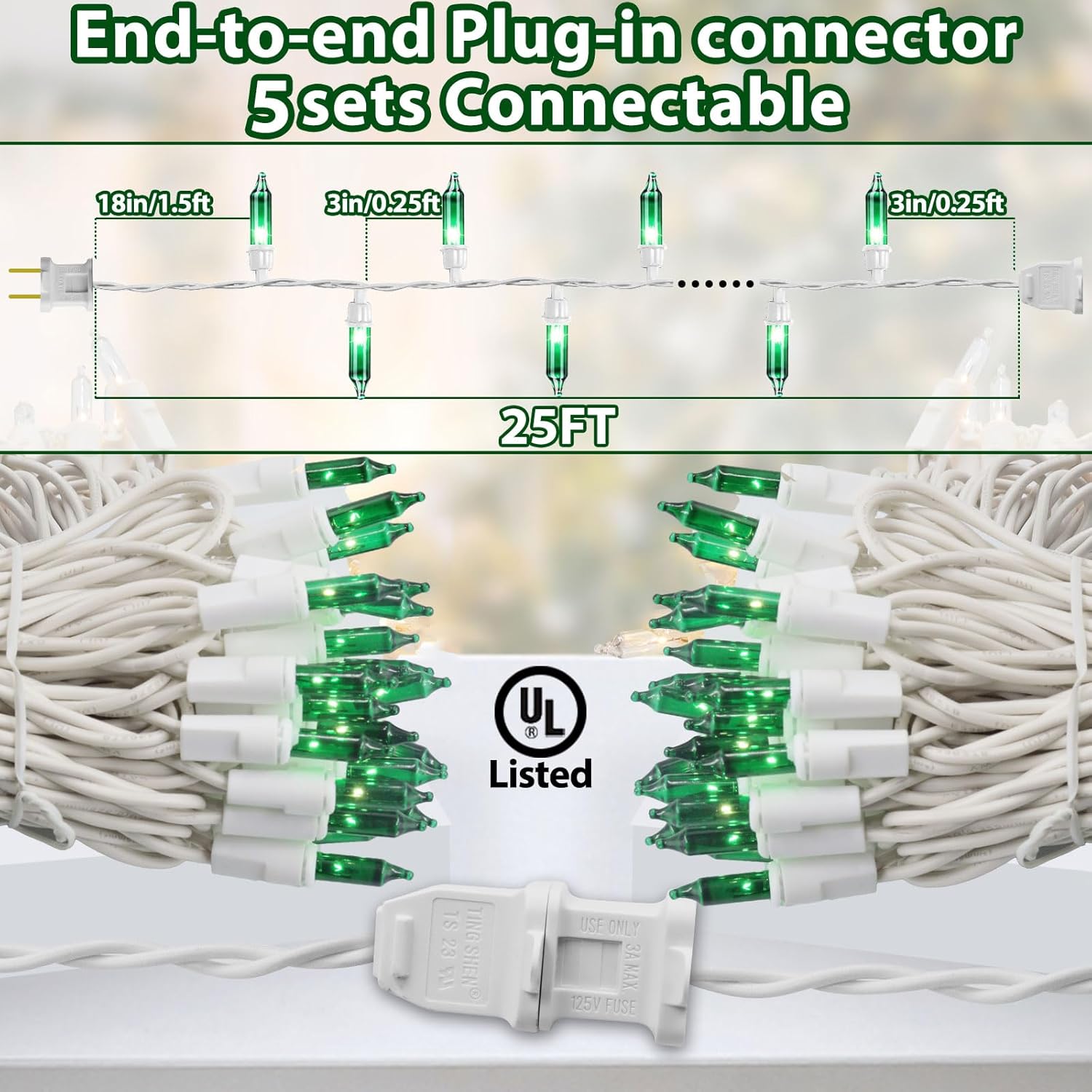 - End-to-End Connectable: 18" Lead Wire, 3" End Connector, 3’’ spacing between bulbs, 0.34 amperes. These green mini string lights can be end-to-end connected, up to 5 sets(125FT 500Lights). You can better dress up your Christmas tree or other places and let the lights expand the lighting range to increase the Christmas atmosphere for your holiday.