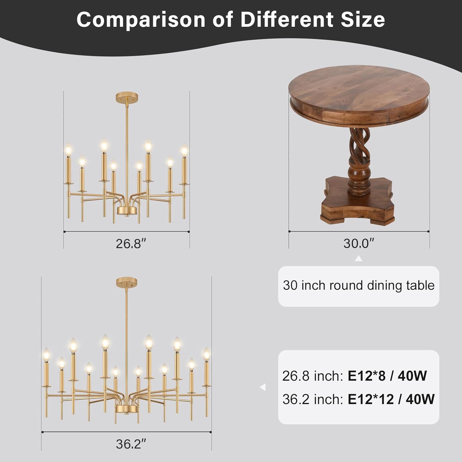 - Dimmable and E12 Bulb Compatibility: With 8 E12 candelabra sockets, this gold chandelier is compatible with various E12 bulbs (incandescent, LED, CFL, and halogen, 40W MAX / bulb), offering dimmable functionality to create the perfect ambiance. This gold matte chandelier allows for flexible lighting control, making it suitable as a gold chandeliers for dining room, or master bedroom chandelier (NOTE: bulbs and dimmer are NOT included)
