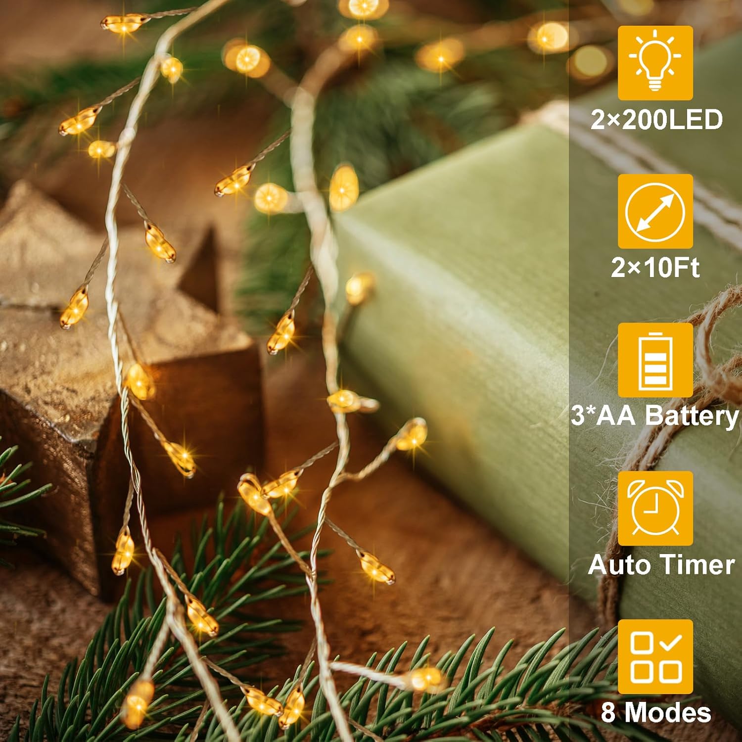2 Pack Cluster Fairy Lights Battery Operated, Total 20Ft 400 LED Christmas String Lights with Timer 8 Modes Silver Wire Firecracker Fairy Lights for Garlands Tree Wedding Decoration (Warm White)