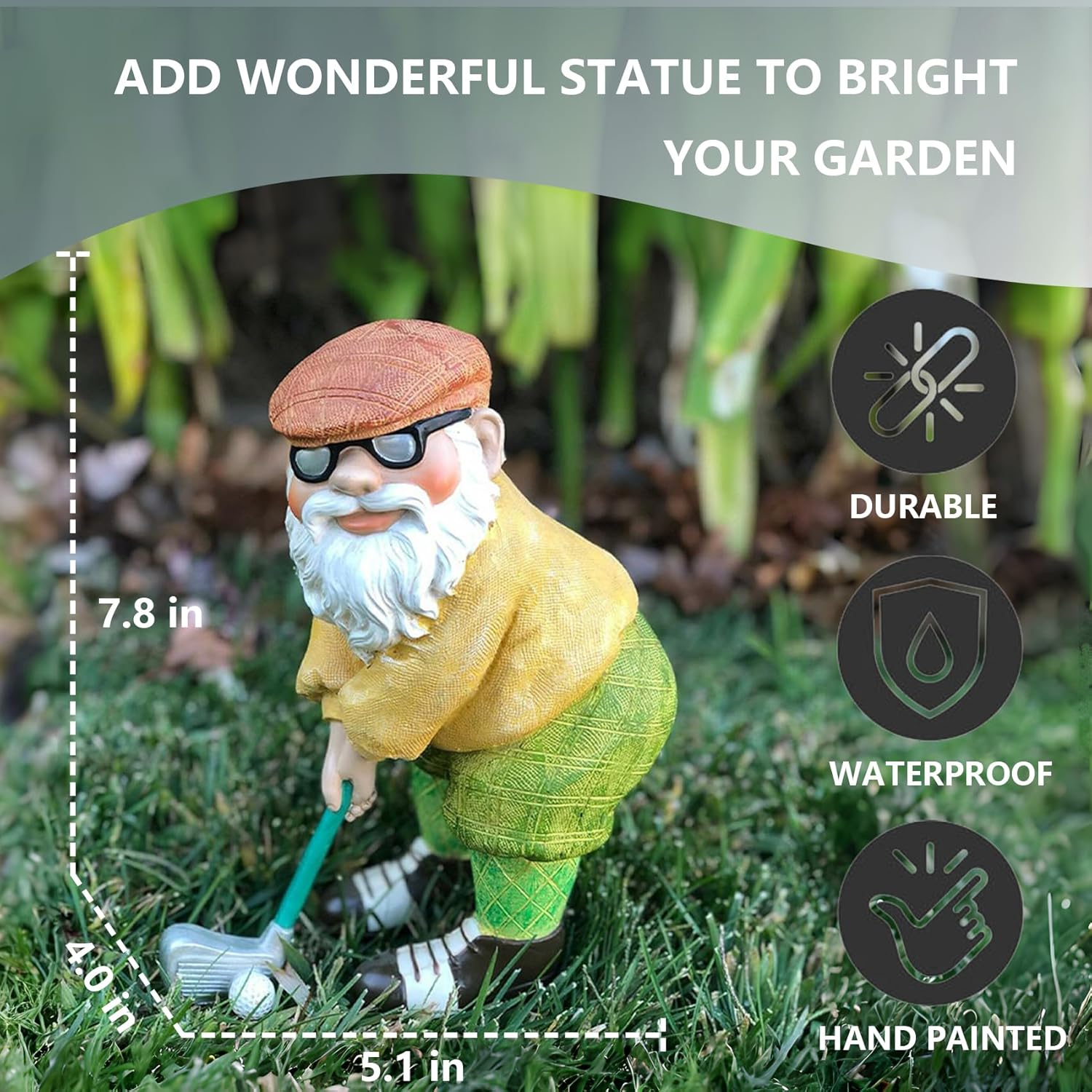 - WATERPROOF & DURABLE: The golfing gnome figurines surface is coated with UV resistant coating, which makes the golfing gnome ornaments sturdy and reliable, waterproof, not easy to fade and break, and can withstand the sunny days, rainy nights, and small snowy days all year long.