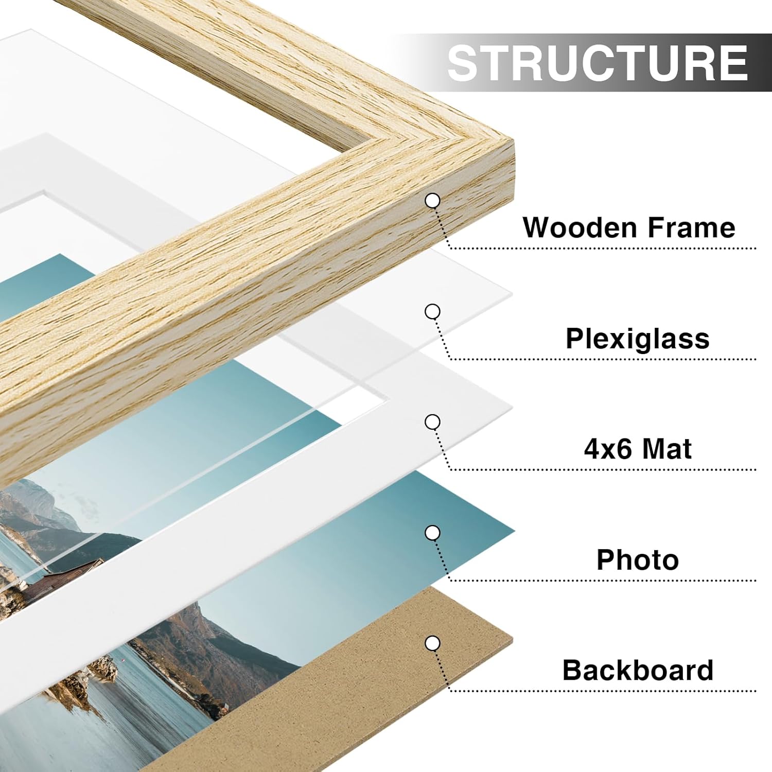 Vittanly 5x7 Picture Frames Set of 9, Shatter Resistant Plexiglass, Display 4x6 Pictures with Mat or 5x7 without Mat, Photo Frames for Wall or Tabletop, Engineered Wood, OAK
