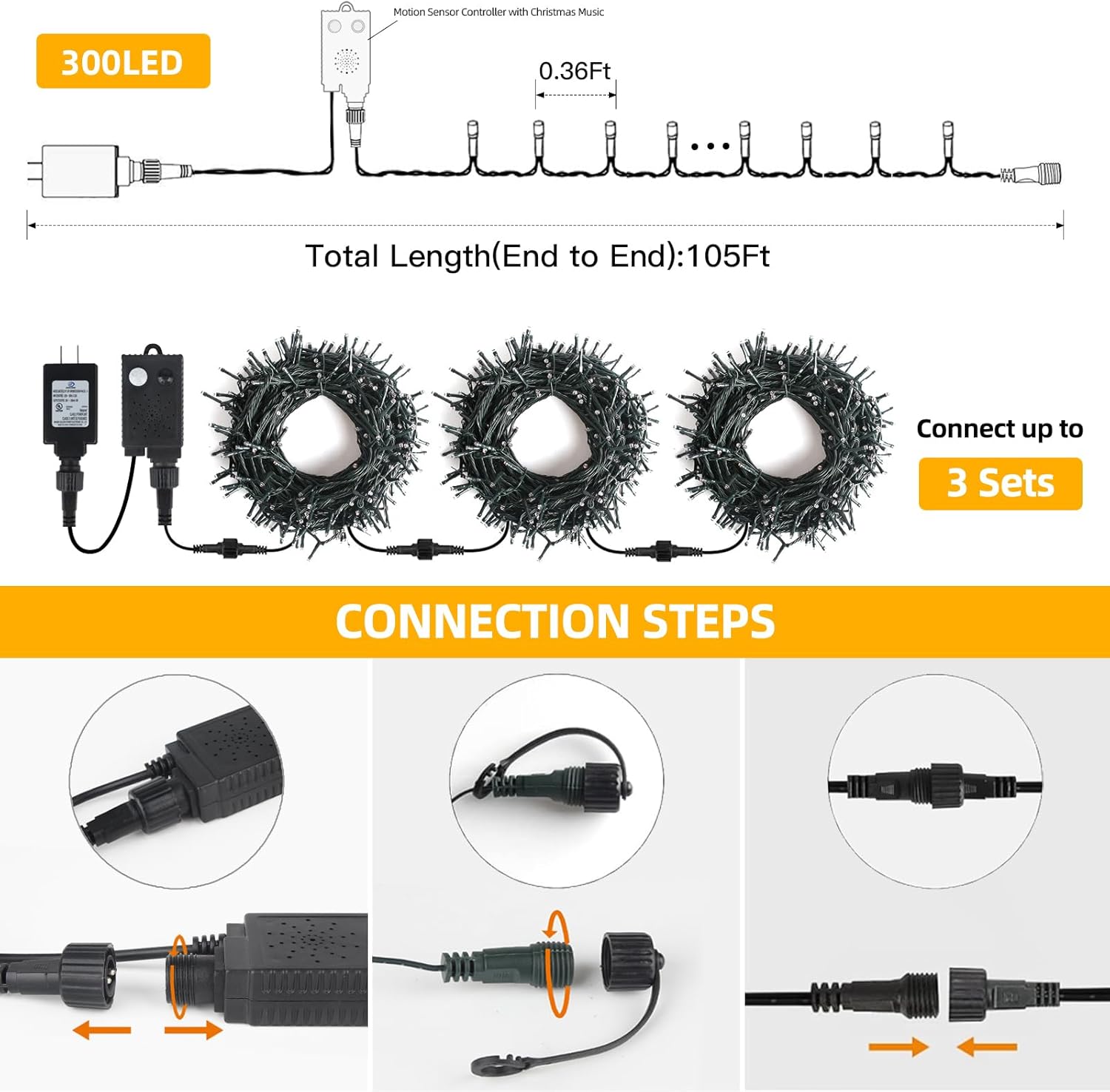 Music Motion Sensor Christmas String Lights 105ft 300 LED, Warm White Christmas Tree Light,End to End Plug In 6 Modes Christmas Lights, Waterproof for Indoor Outdoor Tree Party Yard Room Decor