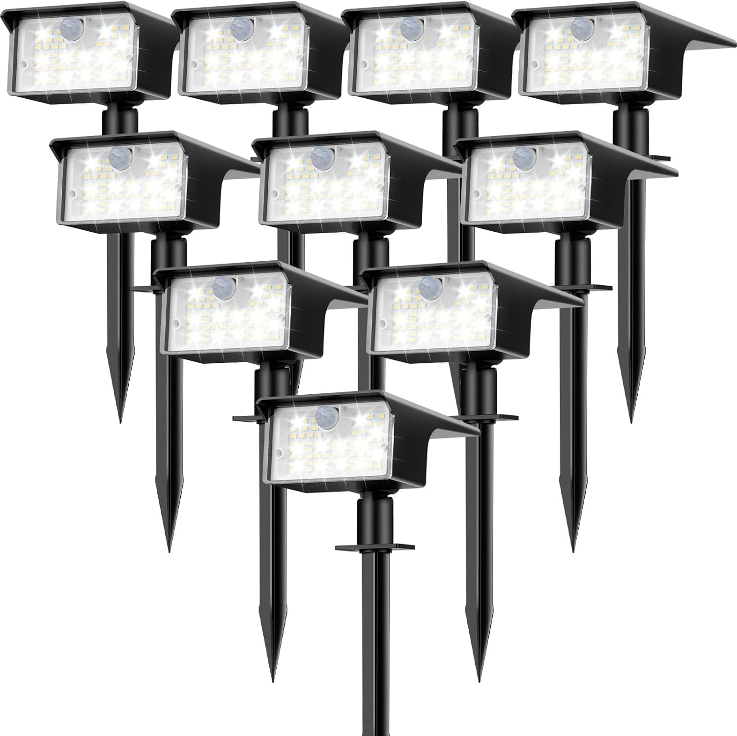 - Ultra-Bright & PIR Motion Sensor: nipify 10 pack new upgraded solar spotlights outdoor with 62 LEDs each, so they produce up to 1000 lumen of 6500K brighter cool light in the dark, light up your garden and a larger area of landscape. Built-in sensitive PIR motion sensor with 120° detection angle, this will give safe, timely and efficient lighting when people, animals and vehicles pass by