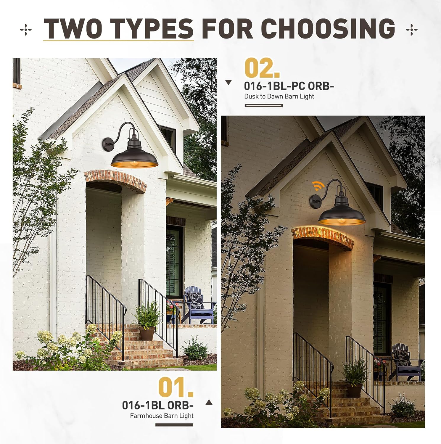 - 【GOOSENECK DESIGN & WEATHER RESISTANCE】Featuring a durable metal dome shade and elegant gooseneck arm design, these 2 pack barn lights are made of sturdy metal construction in an oil rubbed bronze finish with a gold interior. Waterproof and anti-rust, it was durable while adding a unique atmosphere to your house.