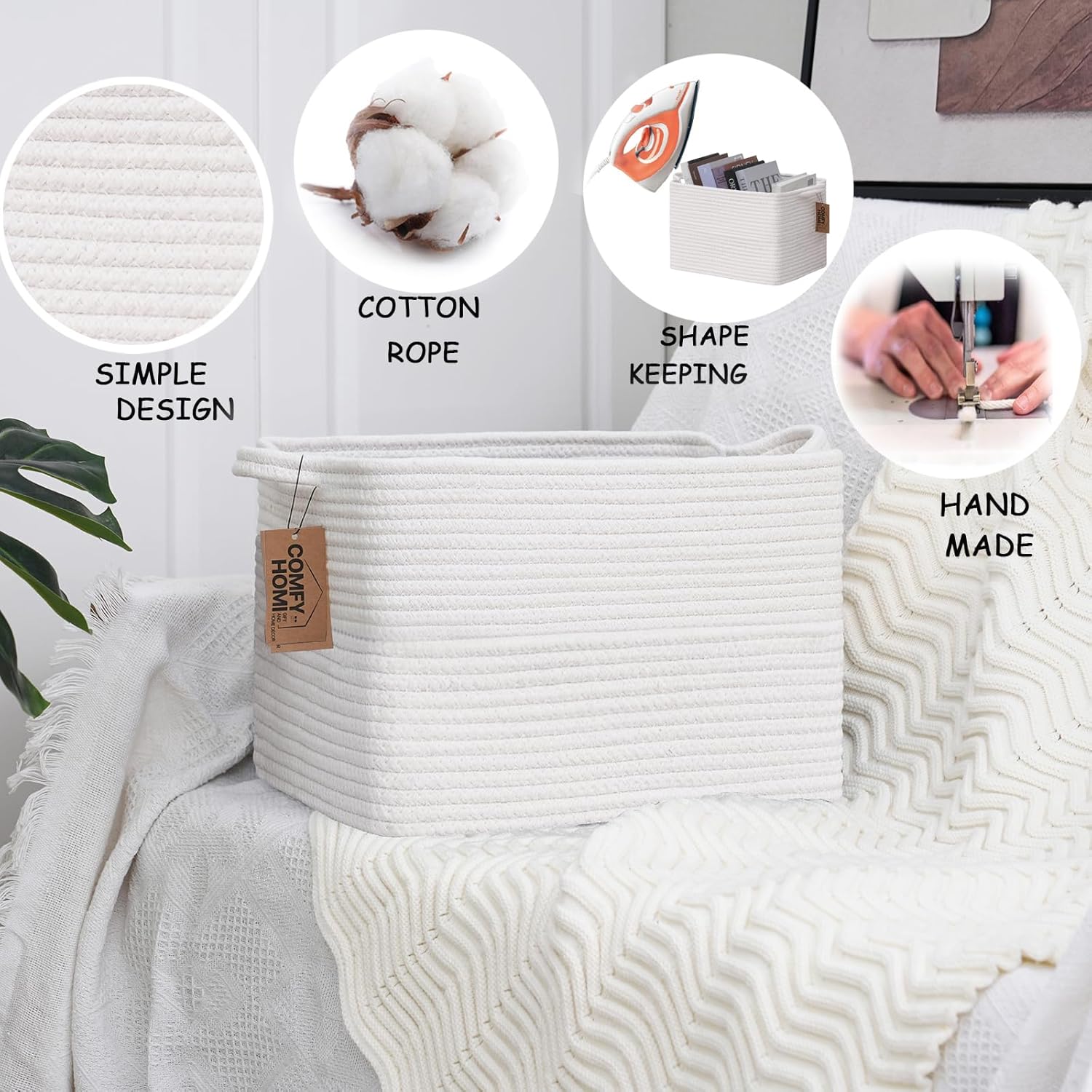 COMFY-HOMI Cotton Rope Woven Basket with Handles for Shelves,Toys,Book, Cloth Storage Baskets Bin for Organizing-13.5"x11"x9.5" Toy Decorative Organizer for Living Room, Bathroom-All White
