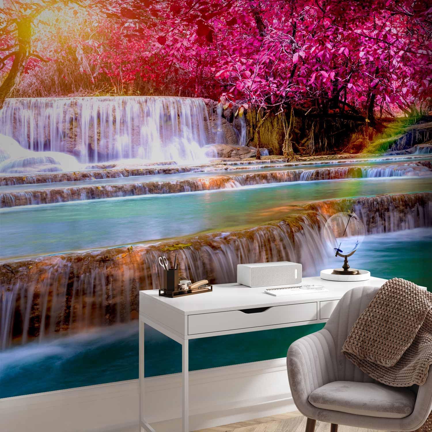 artgeist Premium Wall Mural Waterfall 216x98 in - Non-Woven Photo Wallpaper Art Print Fleece Wall Mural Decoration Poster Picture Design Nature Sun Pink Tree Forest c-B-0474-a-a