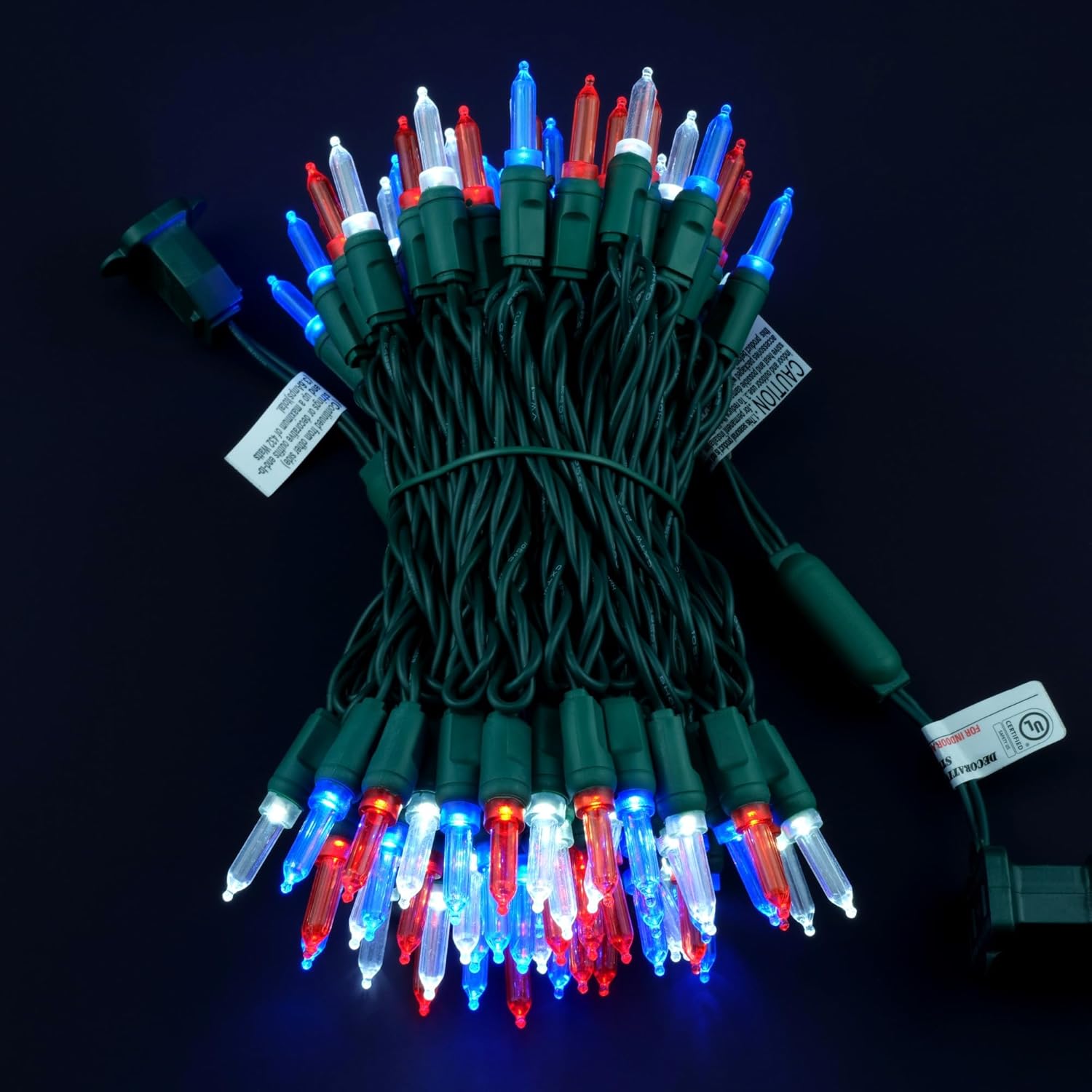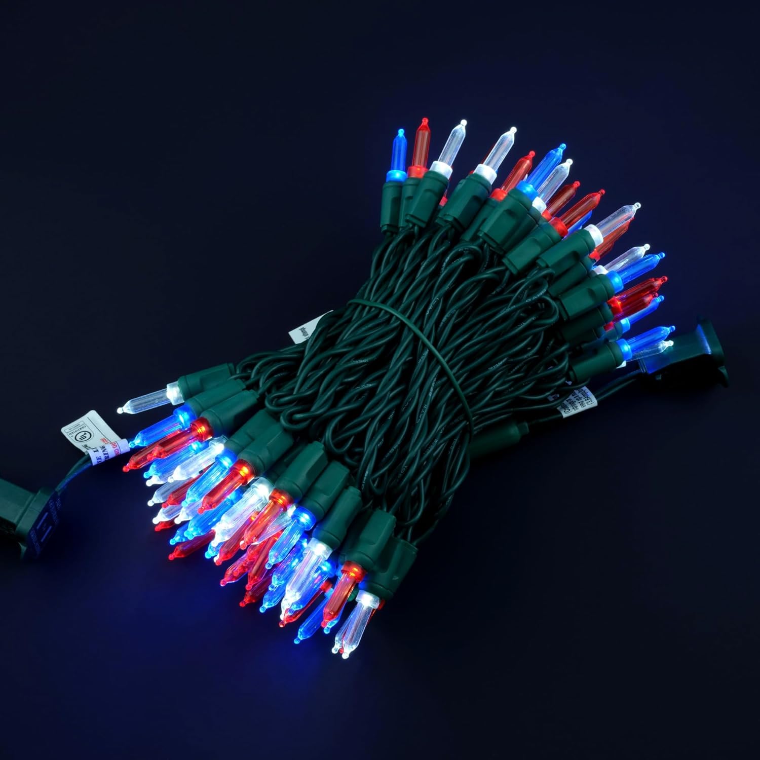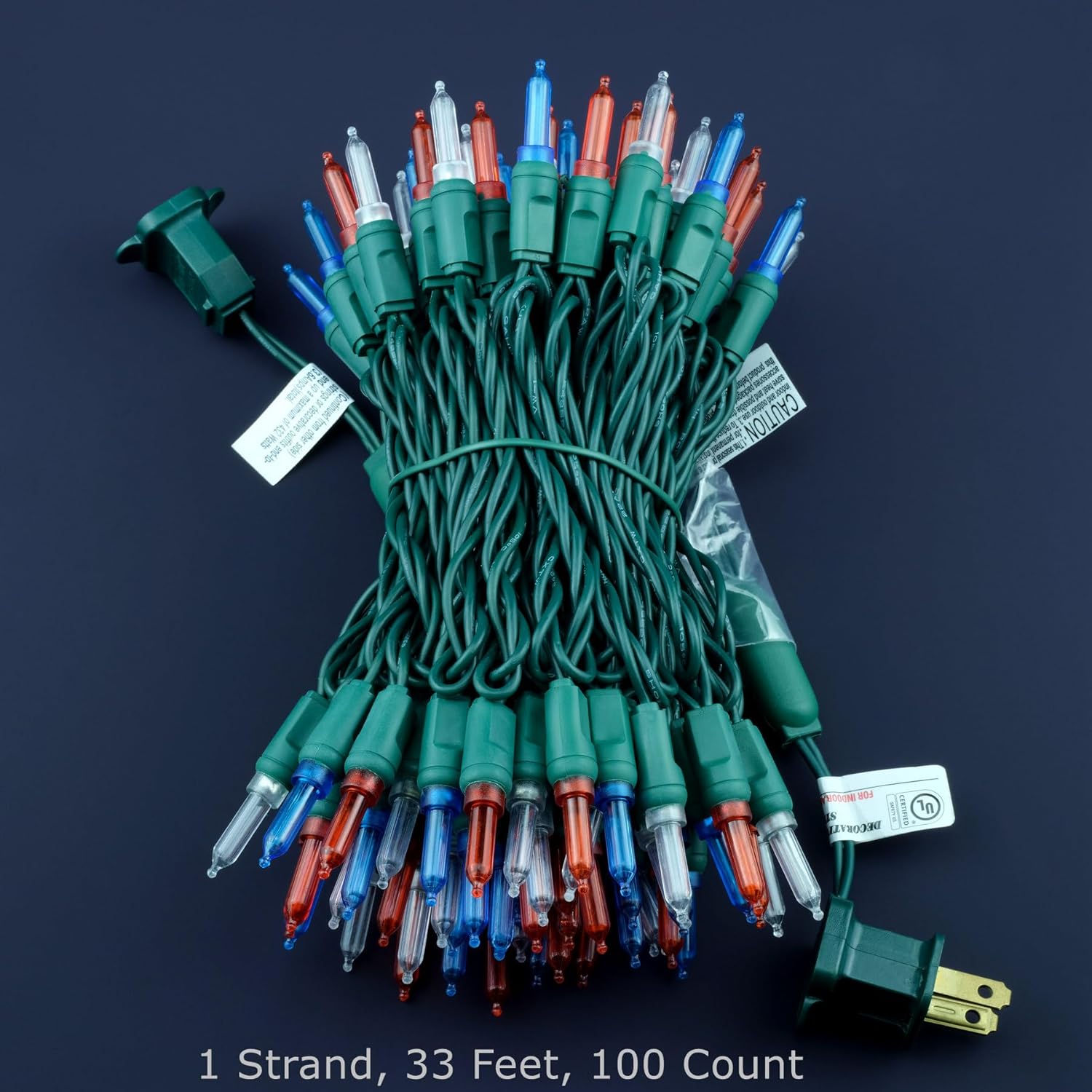 - SPECIFICATIONS ☀ Each pack contains 1 strands of one-piece string lights, total length 33 feet with 100 count multicolor mini lights. Three colors of light bulbs are spaced out, they are red, white, and blue. 22 AWG green cord, 4" lead, 4" spacing, 4" tail.