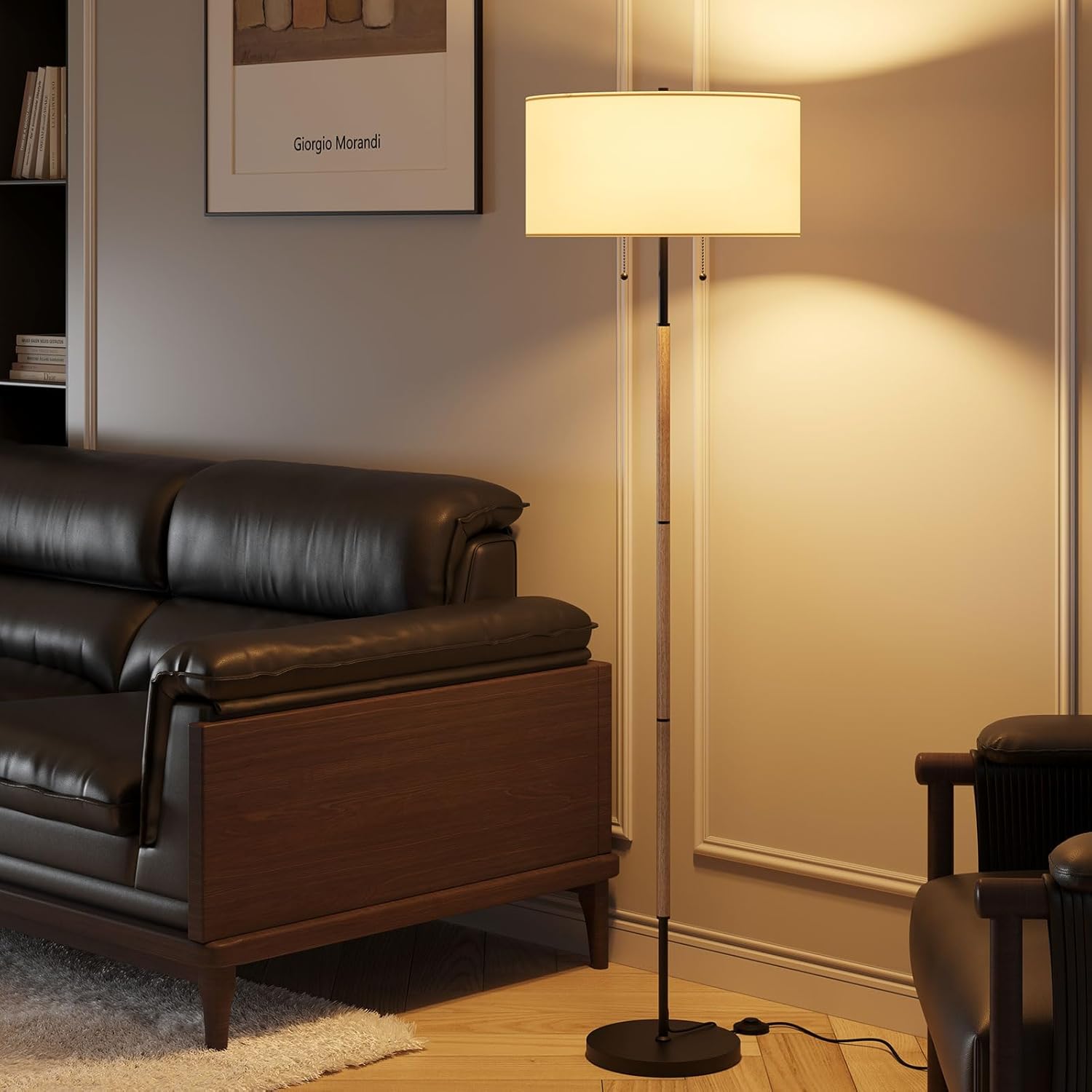 - THE PERFECT LAMP FOR YOUR HOME - The Karjoefar standing lamp will turn your bedroom, office, or living room into a space of elegance. This tall lamp features a white linen drum lampshade that perfectly combines frosted black and rustic tones. Its generous drum lampshade holds space for two bulbs to cast extra light wherever needed.