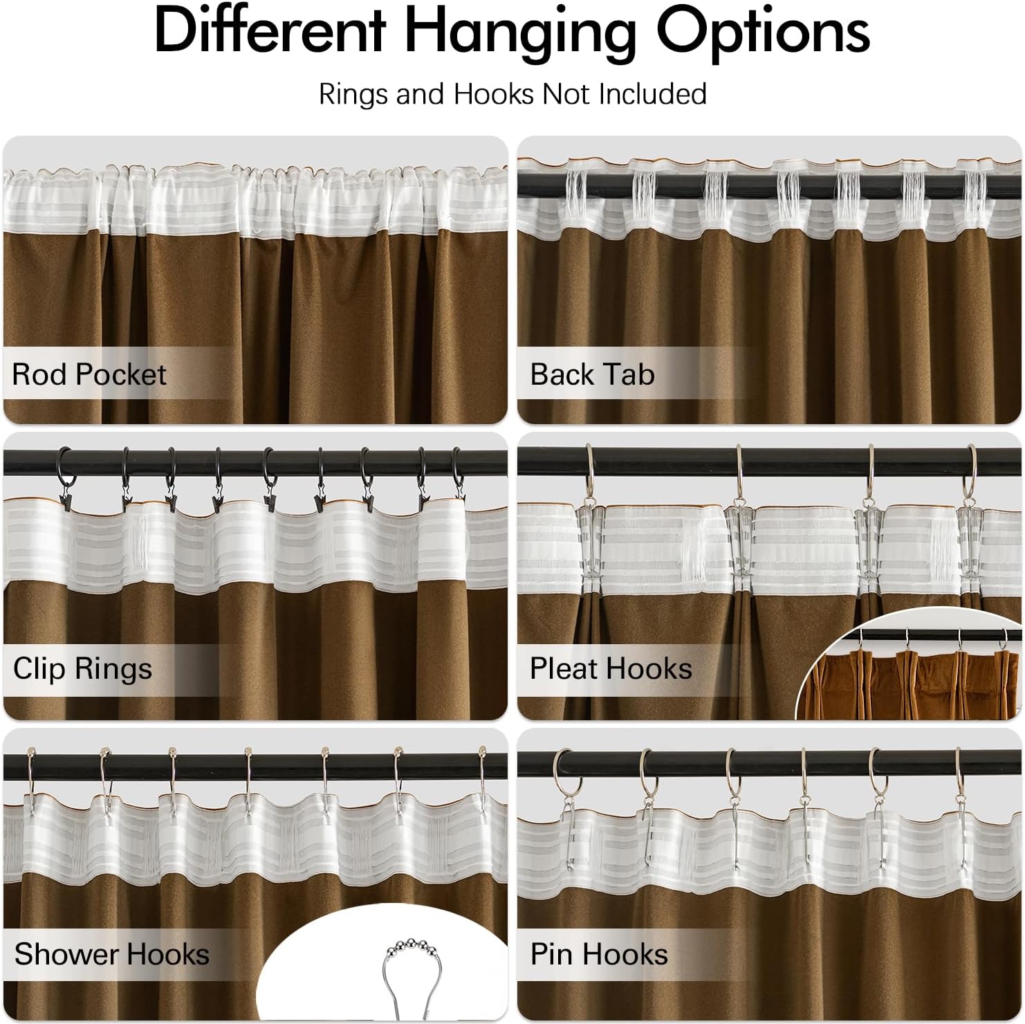 - HANGING OPTIONS: Each curtain panel has 3-in-1 top style design: rod pocket, back tab and pinch pleat. Back loop (2.3 inch) and rod pocket (3.1 inch) fit most standard rod. Curtains also can be hung with clip rings or curtain hooks. 3 ways to meet your various needs.