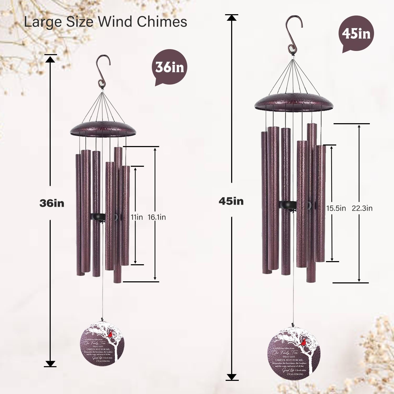- LARGE OUTDOOR WIND CHIMES: Our large wind is available in 36" and 45" sizes. They are made of bronze metal with a waterproof and anti-corrosion coating and can be hung in the yard for a long time. They can easily decorate the backyard, garden, window, terrace, or living room.