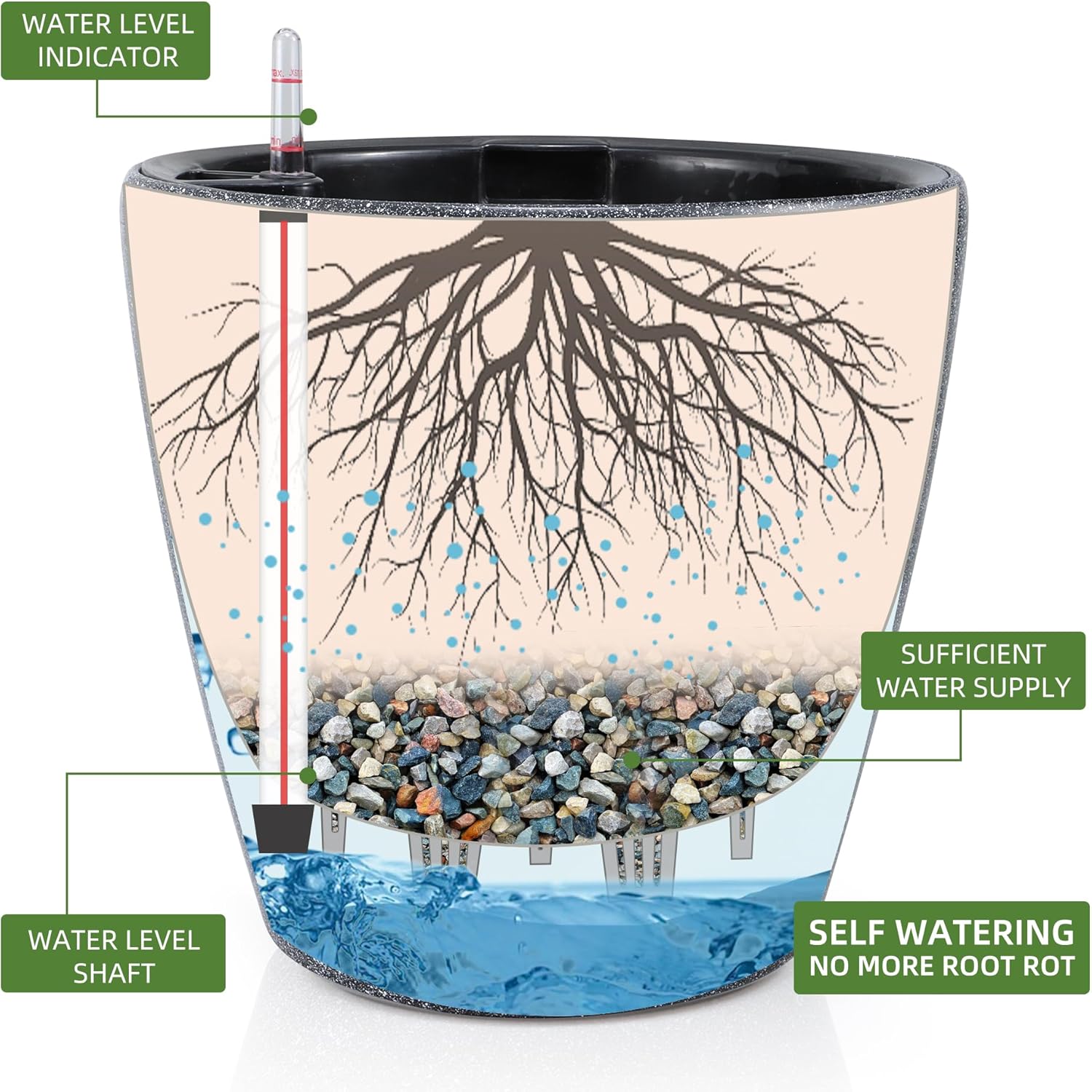 - SELF WATERING & NO MORE ROOT ROT - The smart unique sub-irrigation system is one of the most appealing aspects among all Dexceder planters. The easy-to-use separated integrated water reservoir or catcher- keeps your soil well aerated and automatic supplies plants with the right amount of ongoing moist air & nutrition for optimal growth. The insert indicator shows you the exact time to water again. The full water supply period can single-handedly last over 3 weeks based on different live plants