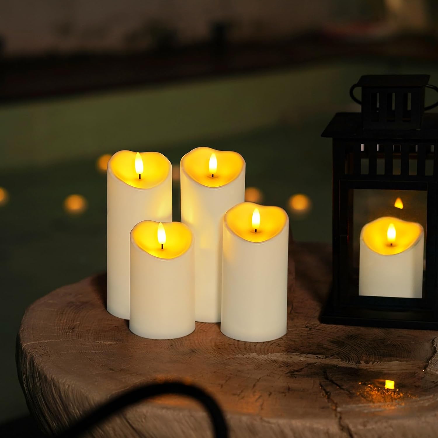 Homemory Outdoor Waterproof Flameless Candles, LED Candles, Battery Operated Candles with Remote and Timers, Electric Fake Plastic Pillar Candles, Ivory White, D3 H4 5" 6" 8" 8", Set of 5