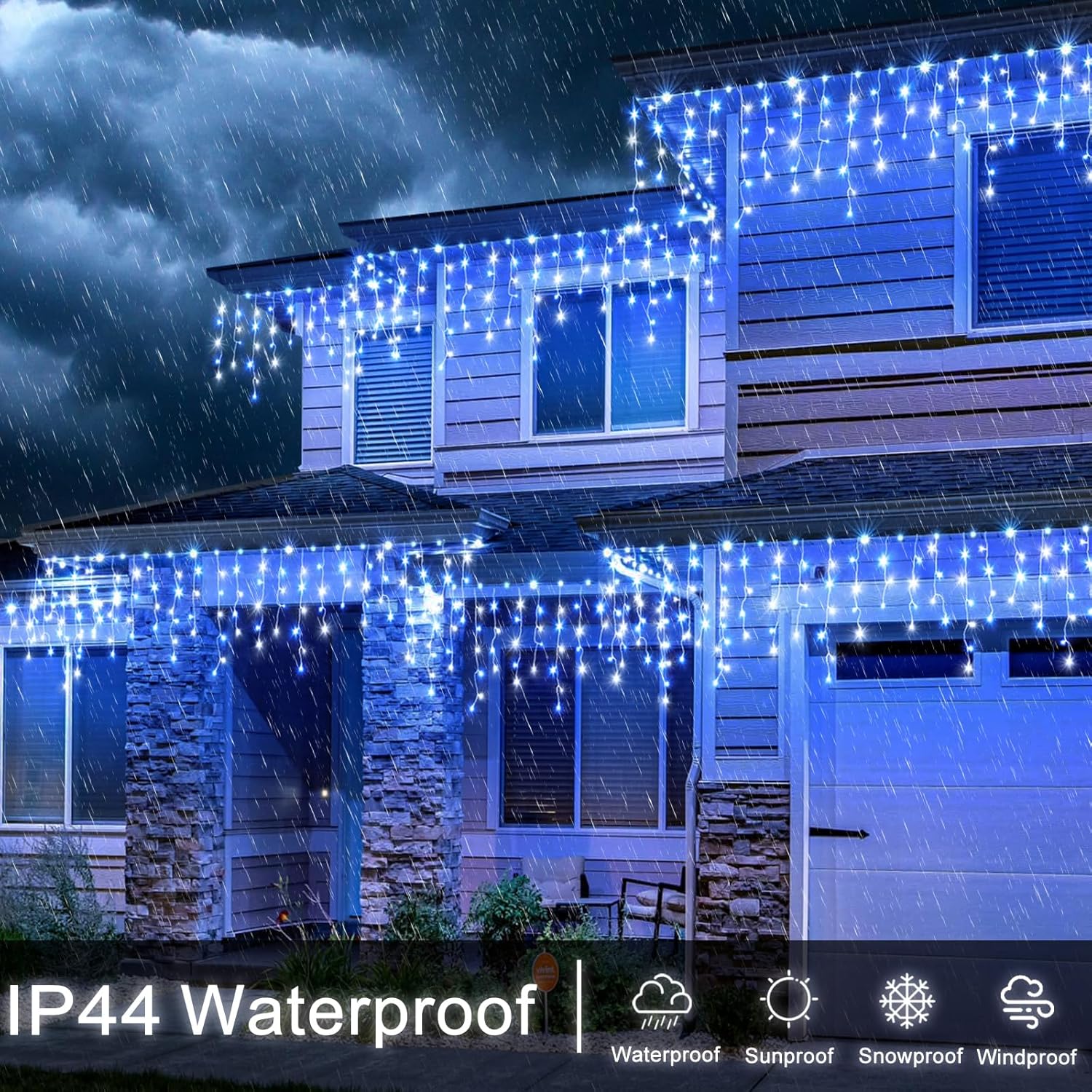 - [Waterproof&UL certified] The icicle lights are IP44 waterproof, which is perfect for outside decoration and can work normally even in wind, rain, freezing rain, heavy snow and freezing cold temperatures. These Christmas lights has approved UL Certification, output voltage is 29V, it's completely safe to touch. These led icicle lights are made of 100% premium copper wire and will not overheat even after prolonged use.