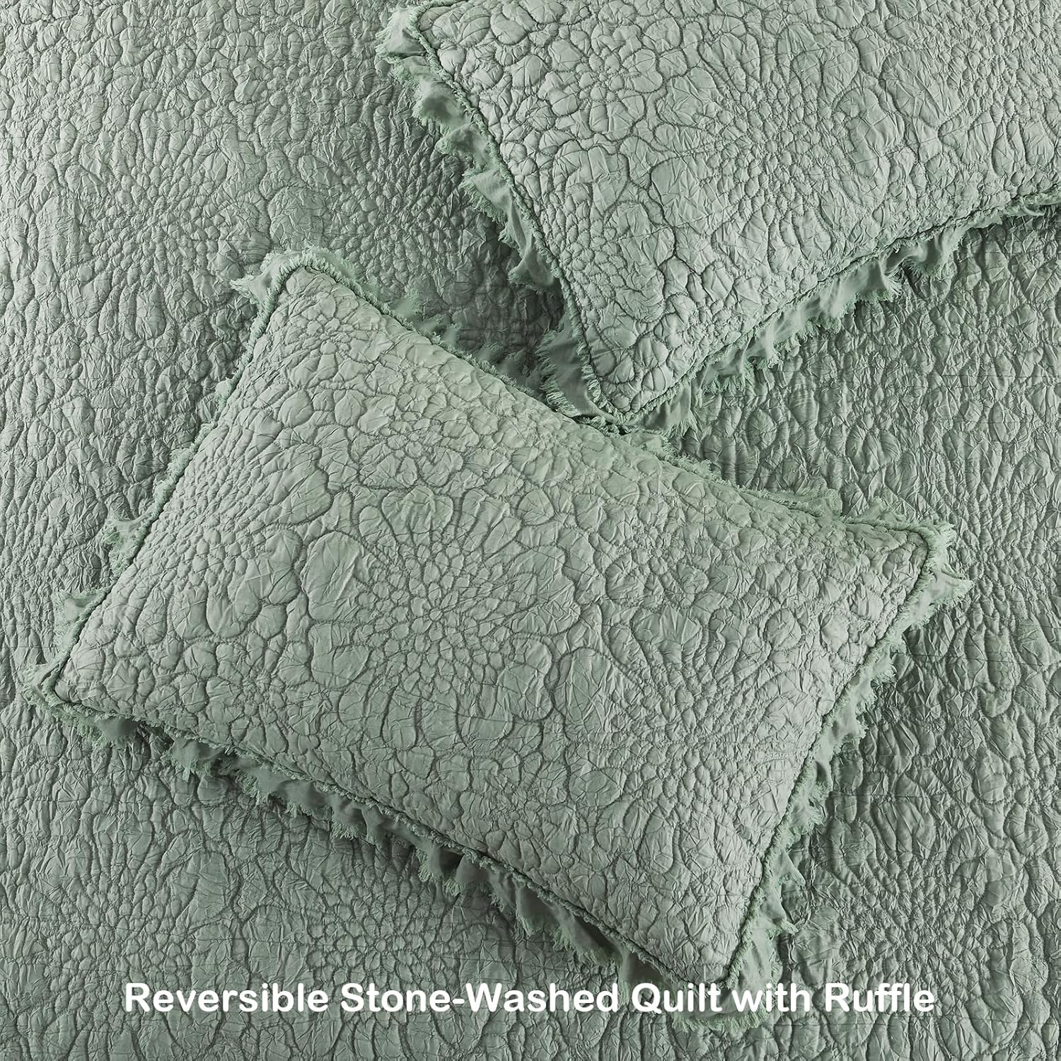 HORIMOTE HOME Sage Green Ruffled Quilt Twin Size, Stone-Washed Microfiber Lightweight Crinkled Farmhouse Rustic Shabby Chic Bedding Set, 2 Pieces Reversible Bedspread with Pillow Sham for All Season