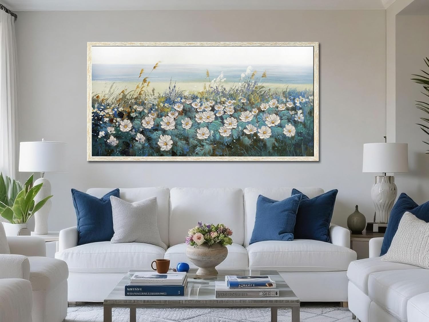 Arjun Flowers Wall Art Canvas White Daisy Floral Painting Blue Coastal Landscape Picture Modern Artwork for Living Room Bedroom Bathroom Dinning Room Office Home Wall Decor Large Framed 40"x20"