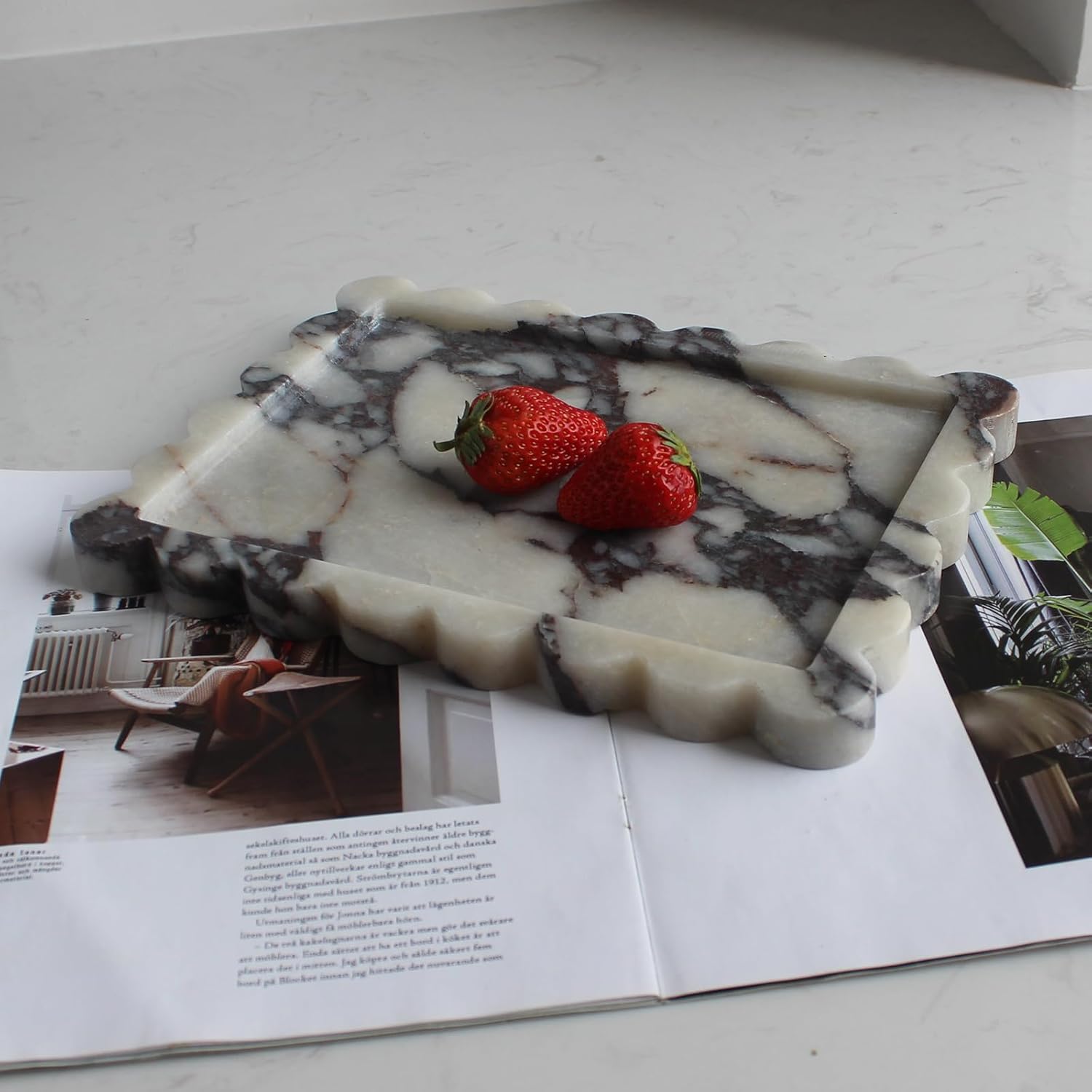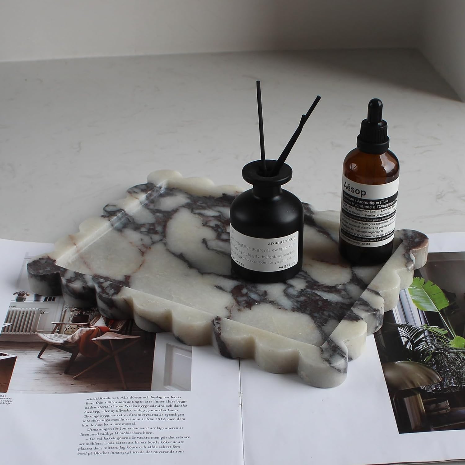 Natural Luxury Scalloped Marble Tray 10.8"x8", Rectangle Vanity Tray for Bathroom Kitchen Counter, Decorative Tray for Dresser Home Decor (calacutta Purple)