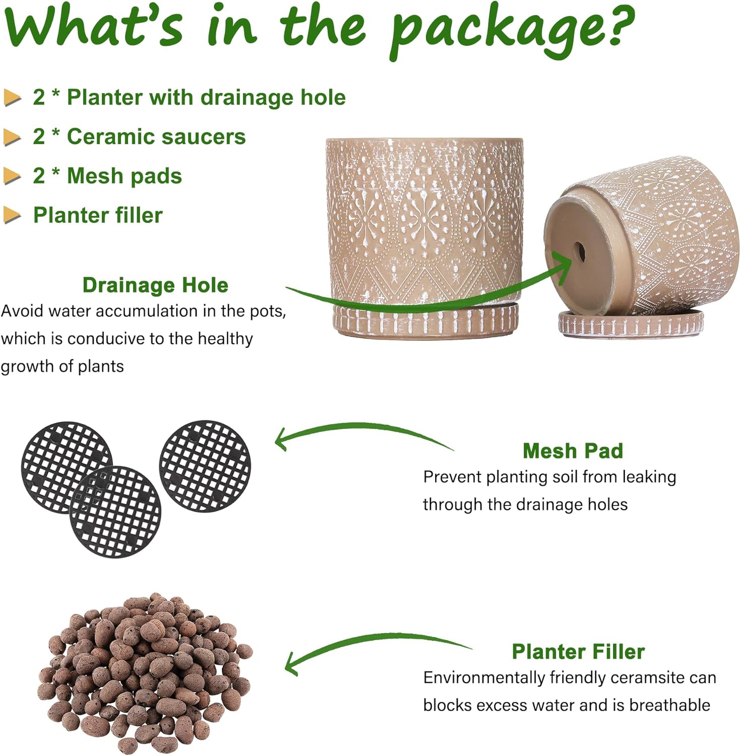 - Size & Package : 8 Inches + 6 Inched plant pot. Package: contains 2 ceramic flower pots, 2 ceramic saucers and 2 mesh pads(NOT INCLUDE PLANTS)