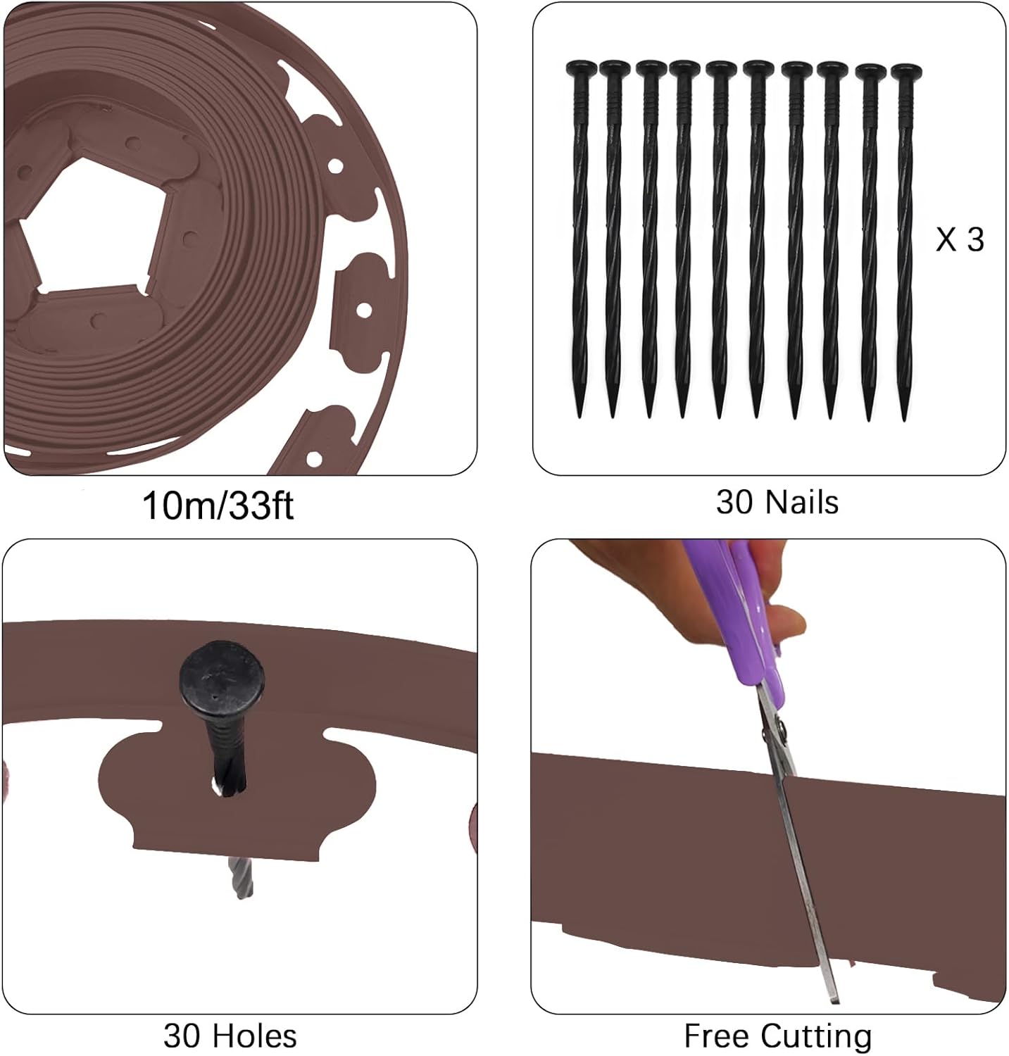 Landscape Edging 33FT, 2in Tall Garden Edging with 30pcs Anchoring Spikes Flexible Edging for Landscaping, Lawn Edging, Paver, Flower Bed Edging Borders, Brown