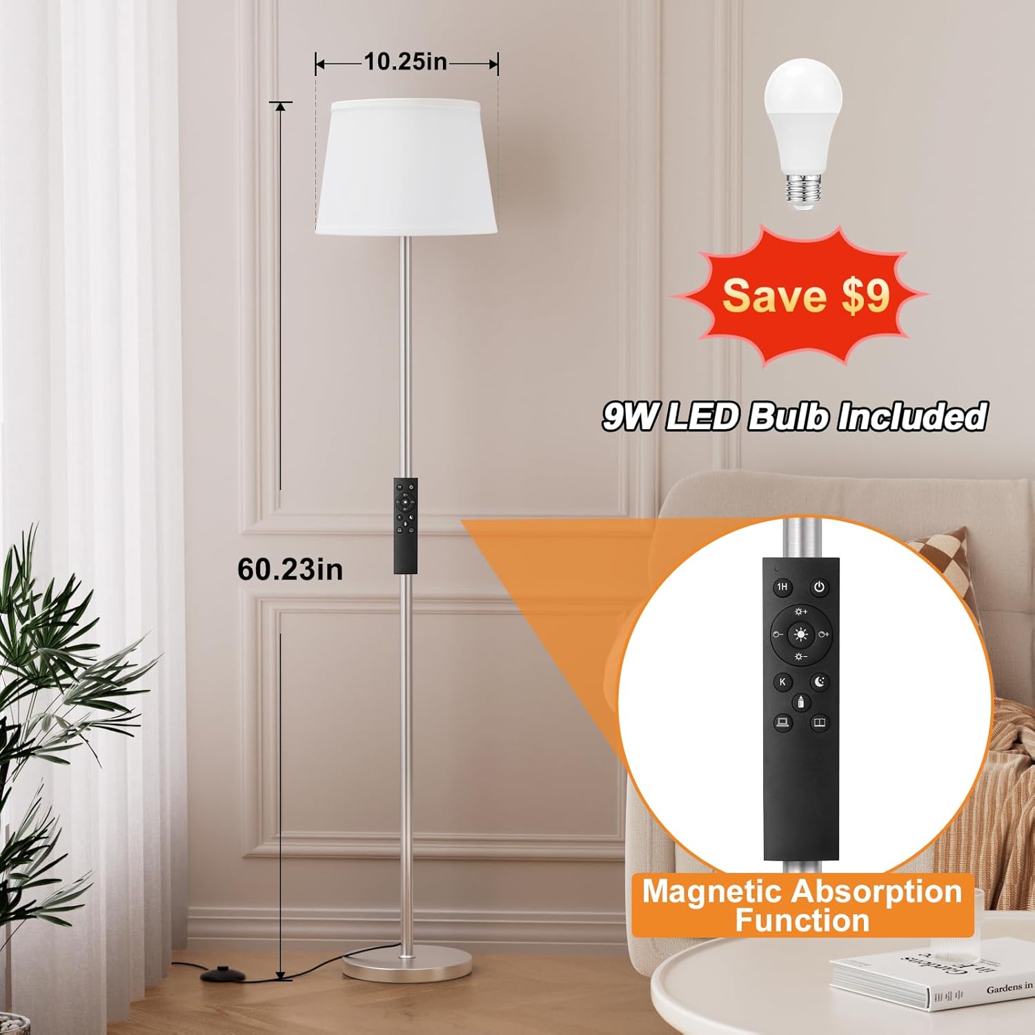 - 【Ideal Present for Your Home】- The elegant design of this stand up lamp can be easily placed in any room of the house, suitable for any room from industrial to modern or traditional decor. Especially if you're moving to a new house where many rooms don't have overhead lights, the silver floor lamp is a great addition to any room. The remote control is magnetic and we recommend that you place it on the surface of the lamp's metal pole so you don't lose the remote!