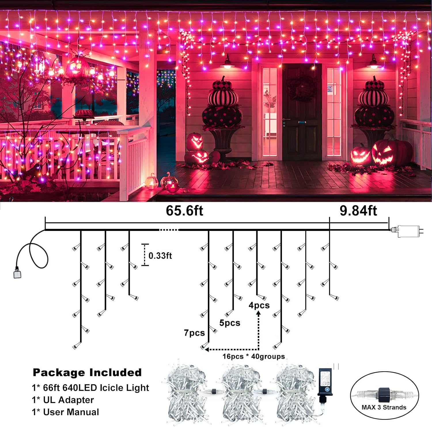 Halloween Icicle Lights, 66FT 640 LED Purple & Orange Icicle Lights for Outside with 8 Modes 120 Drops, Waterproof Plug in String Light for Indoor Outdoor House Yard Patio Party Holiday Decorations