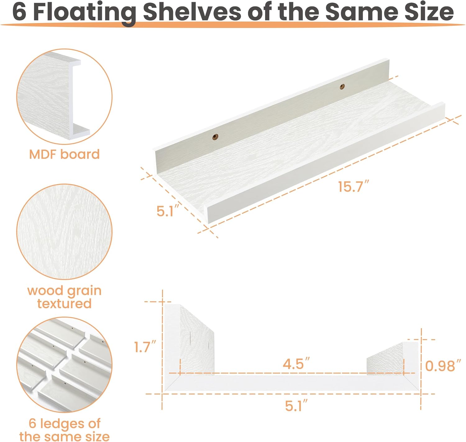 - Value for Money - The 6pack wall shelves not only can be assembled into a long shelf measuring up to 31 inches for wall display, but also can be placed individually in every corner, organizing your small items at any time.