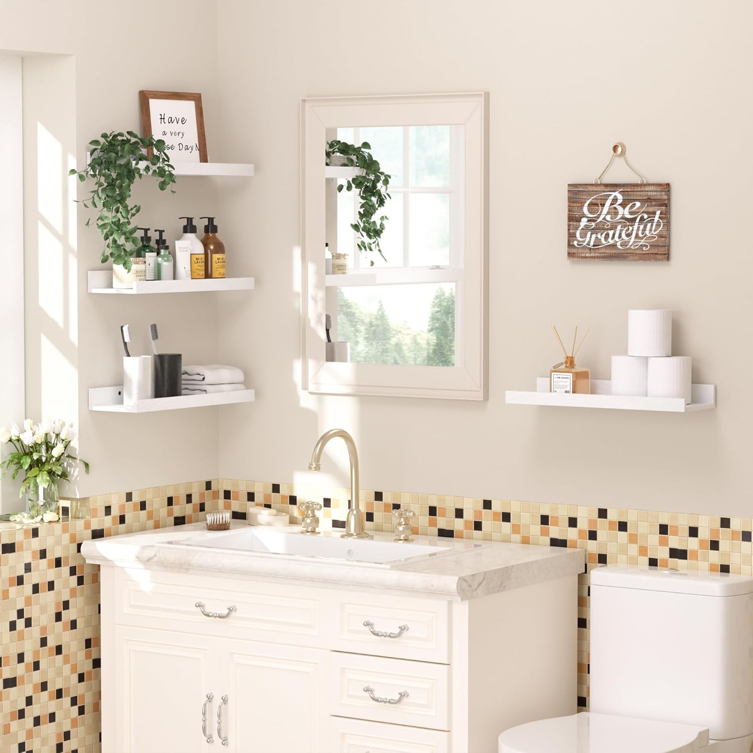 upsimples Floating Shelves for Wall, Wall Shelves for Decor Storage Set of 6, Wall Mounted Wood Shelf for Bedroom, Living Room, Bathroom, Kitchen, Picture Ledge Shelf, White