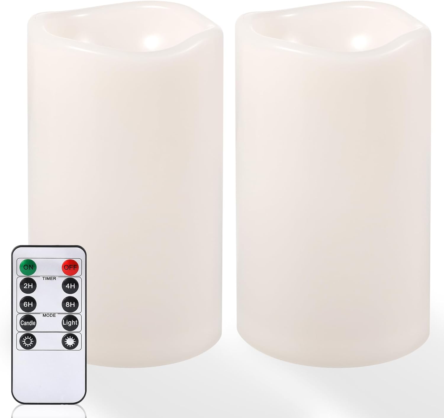 - EXTRA LARGE PILLAR CANDLE: Elevate your outdoor ambiance with our extra-large flameless candle. Made of durable thickened waterproof plastic.Perfect for patio, porch, verandas, pools, and courtyards. Come With 2 x large LED candles (6" in height and 4" in diameter), 1x 10-key remote and a user manual
