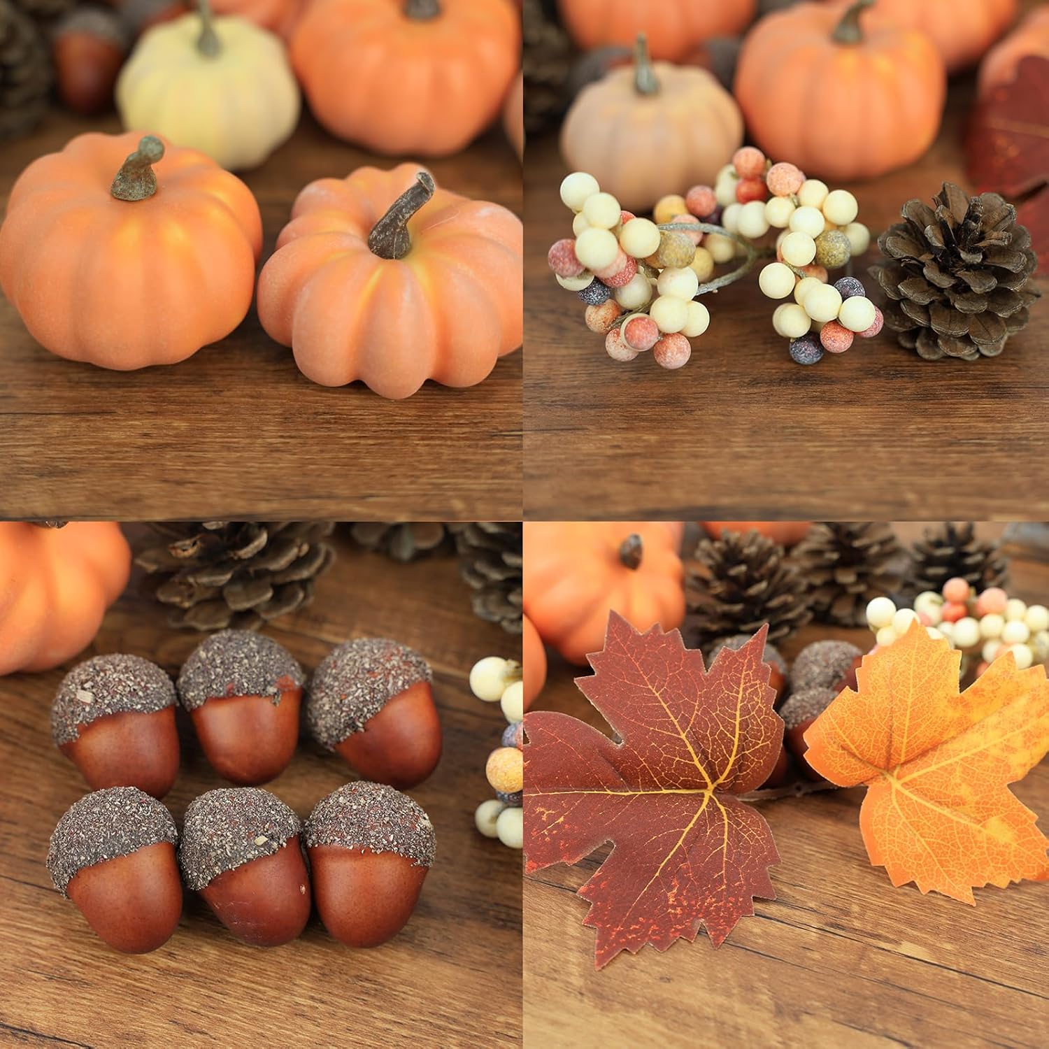 - 【Package Included】8 faux pumpkin, 6 acorns, 4 pinecones, 2 berries, 2 fake maple leaves. Total 22 pcs, covers all of your fall decorations for home needs.