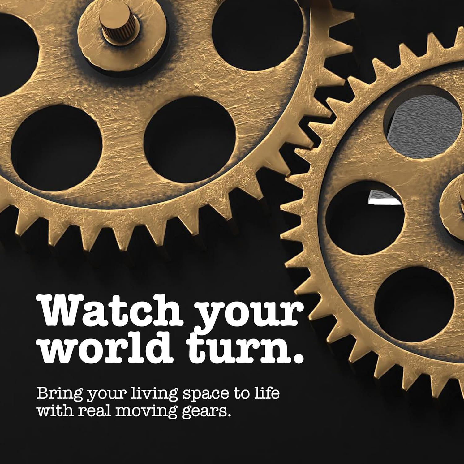- REAL MOVING GEARS: Watch as the 9 unique rotating gears and cogs come to life. The working wooden gears operate independently of the premium metal hands, creating a peaceful farmhouse ambiance in your living room, kitchen, country room, or office. The mechanical clock hands have a silent, sweep movement, eliminating the annoying tick-tock found in many clocks.