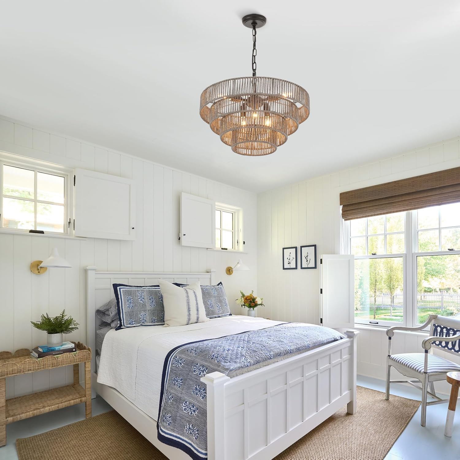 - Eye-catching Design: This woven rattan chandelier is made of wicker woven on grey color with high-quality 4 round metal frames finished by brass, forming a semicircular hollow cage; The color gray exudes a casual elegance without sacrificing style, revealing an indescribable high-level charm for this modern chandelier.