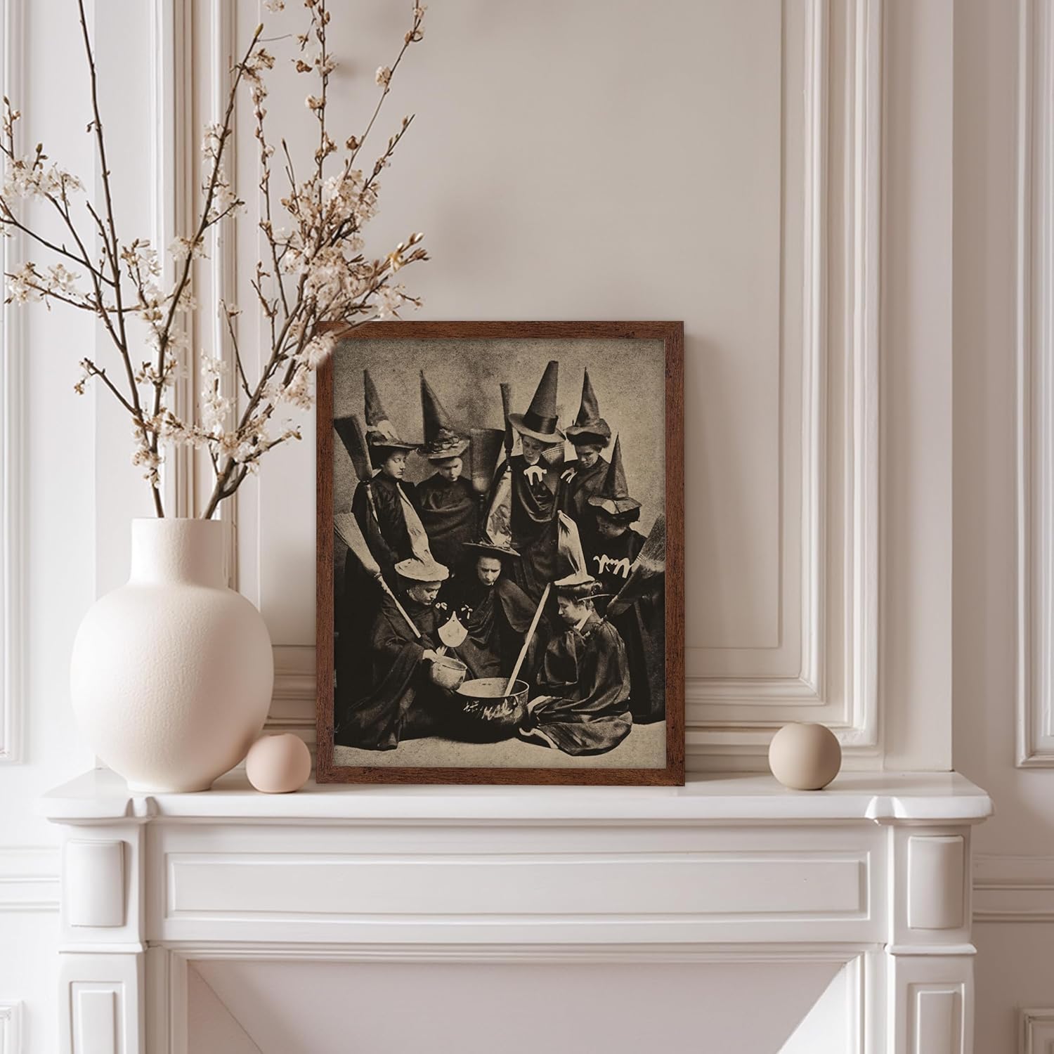 Poster Master Vintage Photograph Poster - Retro Halloween Print - Gift for Artist, Friend - Witches Cooking, Pointy Hats, Broomsticks, Black Magic - Wall Decor for Bedroom, 8x10 Brown Framed