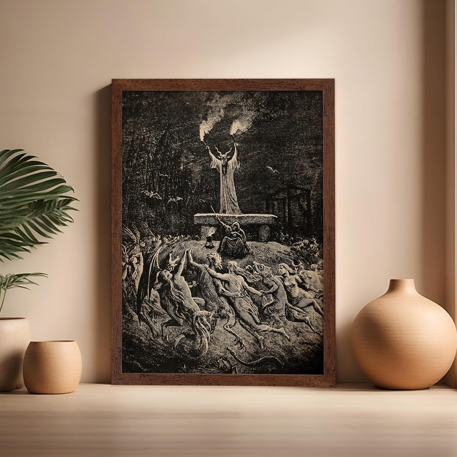 Poster Master Vintage Gustave Dore Poster - Retro Illustration Print - Gift for Gothic, Horror Fan - Dance of Sabbath, Witch, Magic, Spell - Wall Decor for Bedroom, Dorm, 16x20 Brown Framed