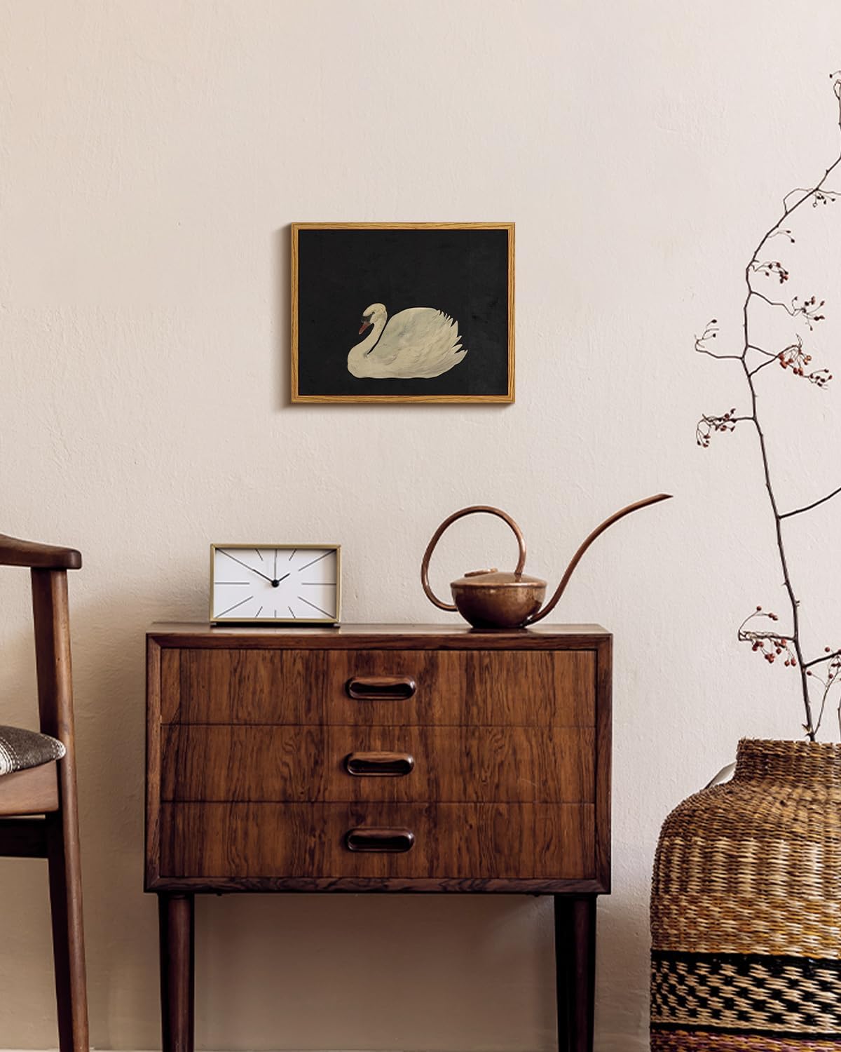 - VINTAGE SWAN OIL PAINTING: Elevate your living space with VIYYIEA swan art canvas wall decor. The swan is gracefully floating on a dark background that accentuates the purity and elegance. The frame around the swan wall art painting adds a sense of classic sophistication. The combination of the black and the luminous swan creates a striking contrast, highlighting the serene beauty of the bird, making it a timeless captivating piece.