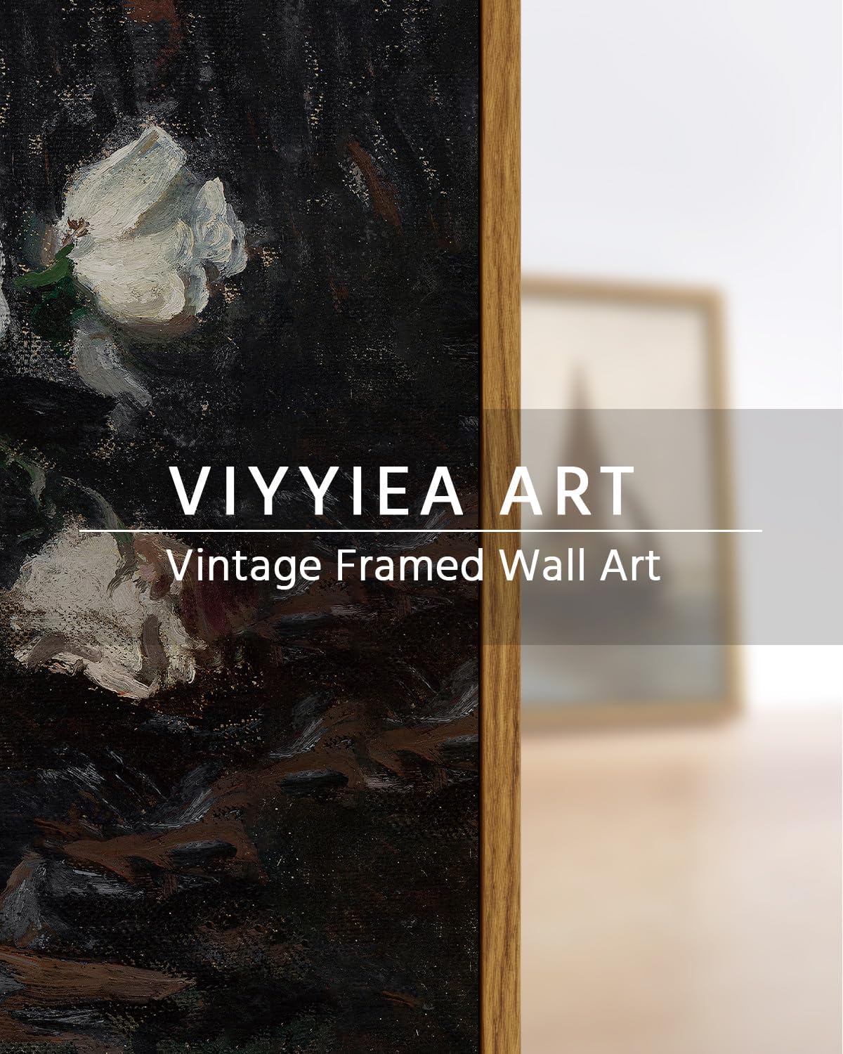 VIYYIEA Framed Canvas Wall Art Home Decor Vintage Botanical Prints White Roses in Vase Rustic Farmhouse Flower Wall Decor Mid Century Pictures Art Prints Floral Room Decor for Living Room 12x16in