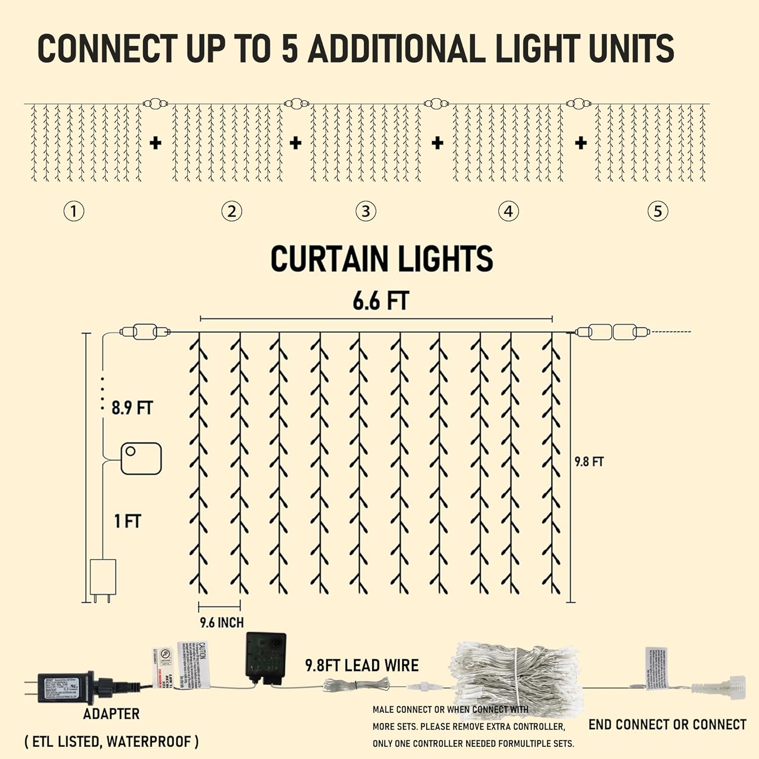 - 300 LED Curtain Lights: Our 9.8x6.6FT 300 LED curtain lights offer a stunning display of warm white fairy lights, featuring 10 light strands with 30 LED lights on each string. The size of the lights are perfect for covering large windows and walls, creating a breathtaking light show. The 9.8ft lead wire offers added support for outdoor use. Designed to be connectable, you can connect up to 5 sets of these string lights together to cover larger areas
