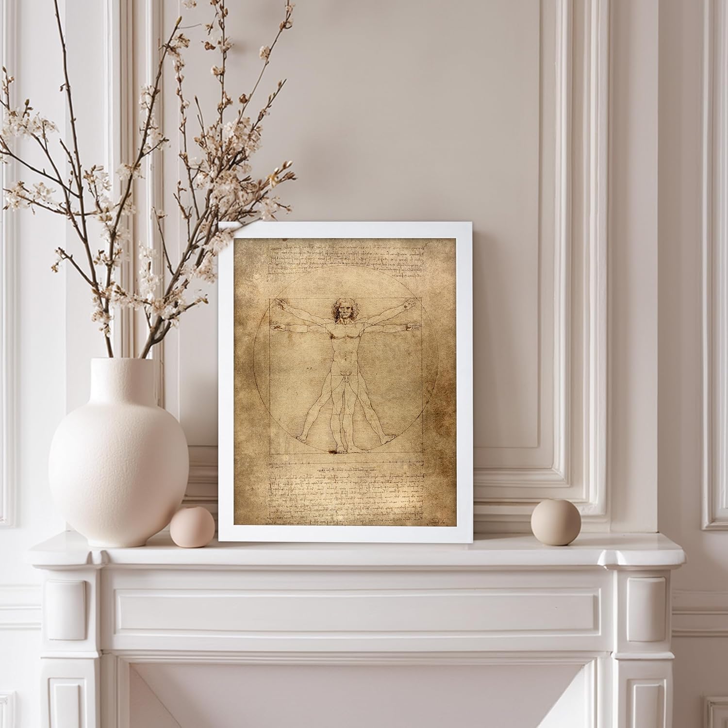 Poster Master Classic Leonardo Da Vinci Poster - Vintage Renaissance Print - Gift for Artist, Friend - Vitruvian Man, Proportion, Symmetry, Human Body - Wall Decor for Office, 8x10 White Framed