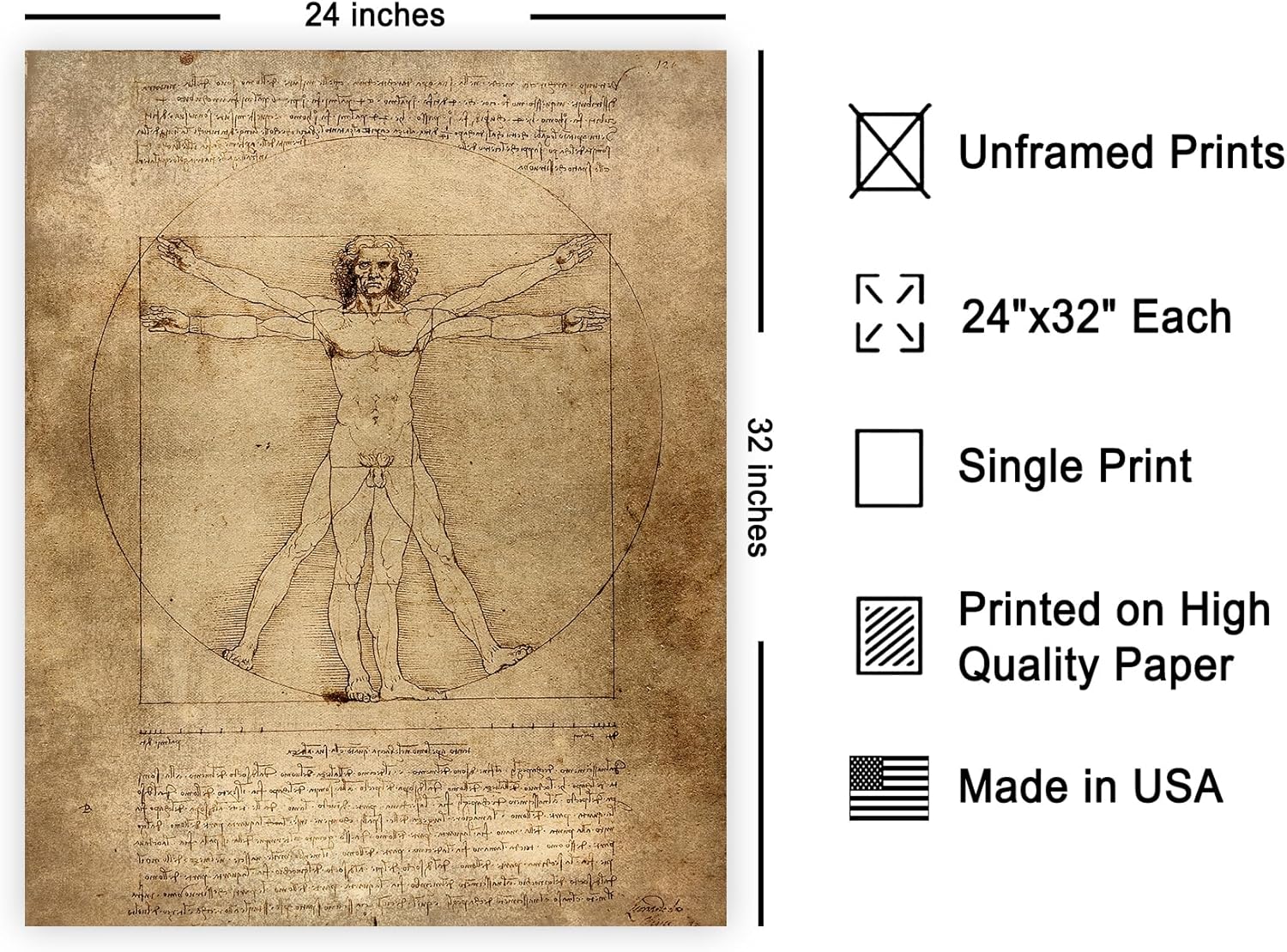 Poster Master Classic Leonardo Da Vinci Poster - Vintage Renaissance Print - Gift for Artist, Friend - Vitruvian Man, Proportion, Symmetry, Human Body - Wall Decor for Office, 24x32 Unframed Wall Art