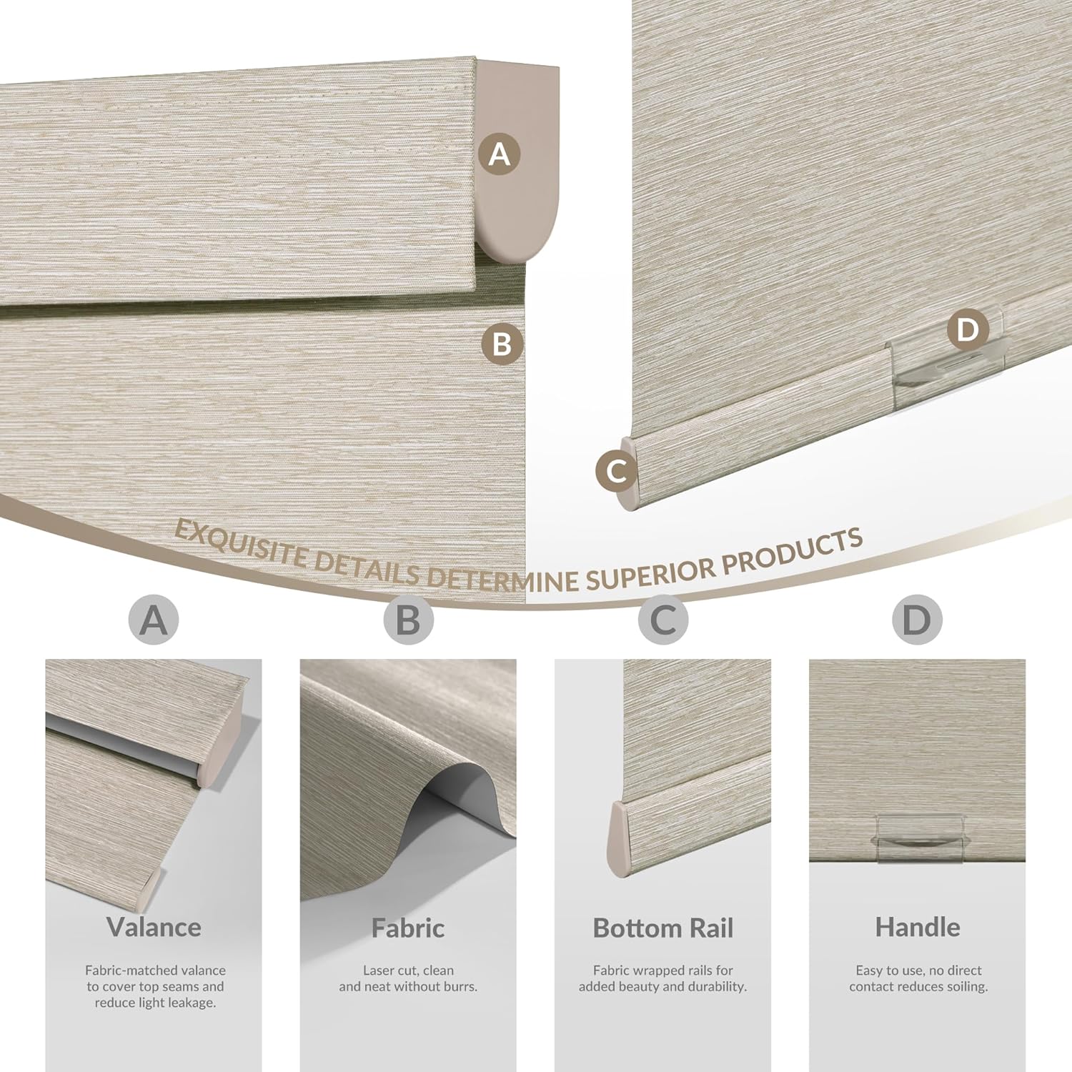 - [Valance Blackout Design, Luxurious and Elegant] Blackout roller shades add an extra layer of hand-stitched valance using fabric to effectively cover the seams of the top rail and reduce light leaks. Give you an excellent light-blocking experience. While the product as a whole using fabric wrapped, uniform color scheme, like a work of art.