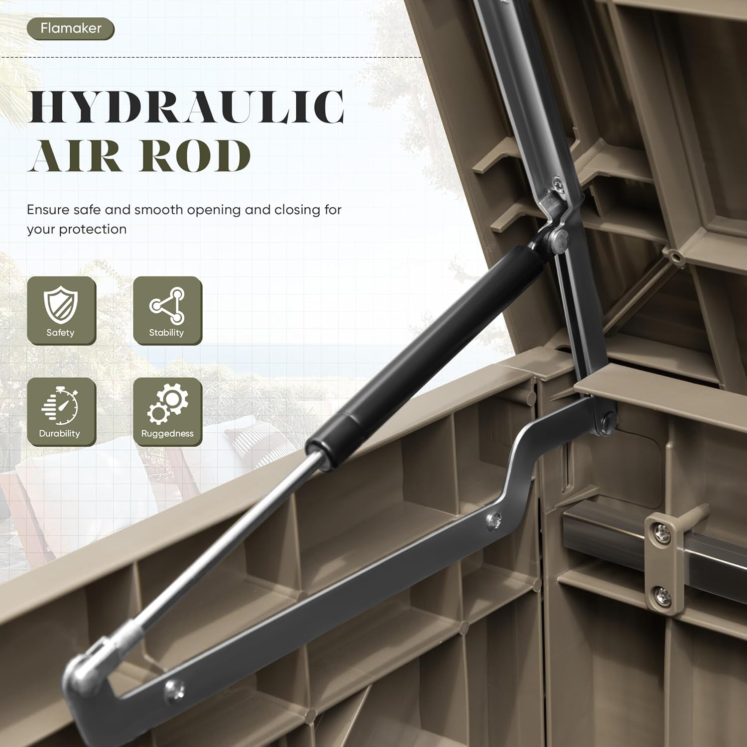 - [Safety Design] The storage box cover and the box are connected by hydraulic rods, which reduces the speed of opening and closing, ensuring the safety, and can be locked to ensure the safety of property