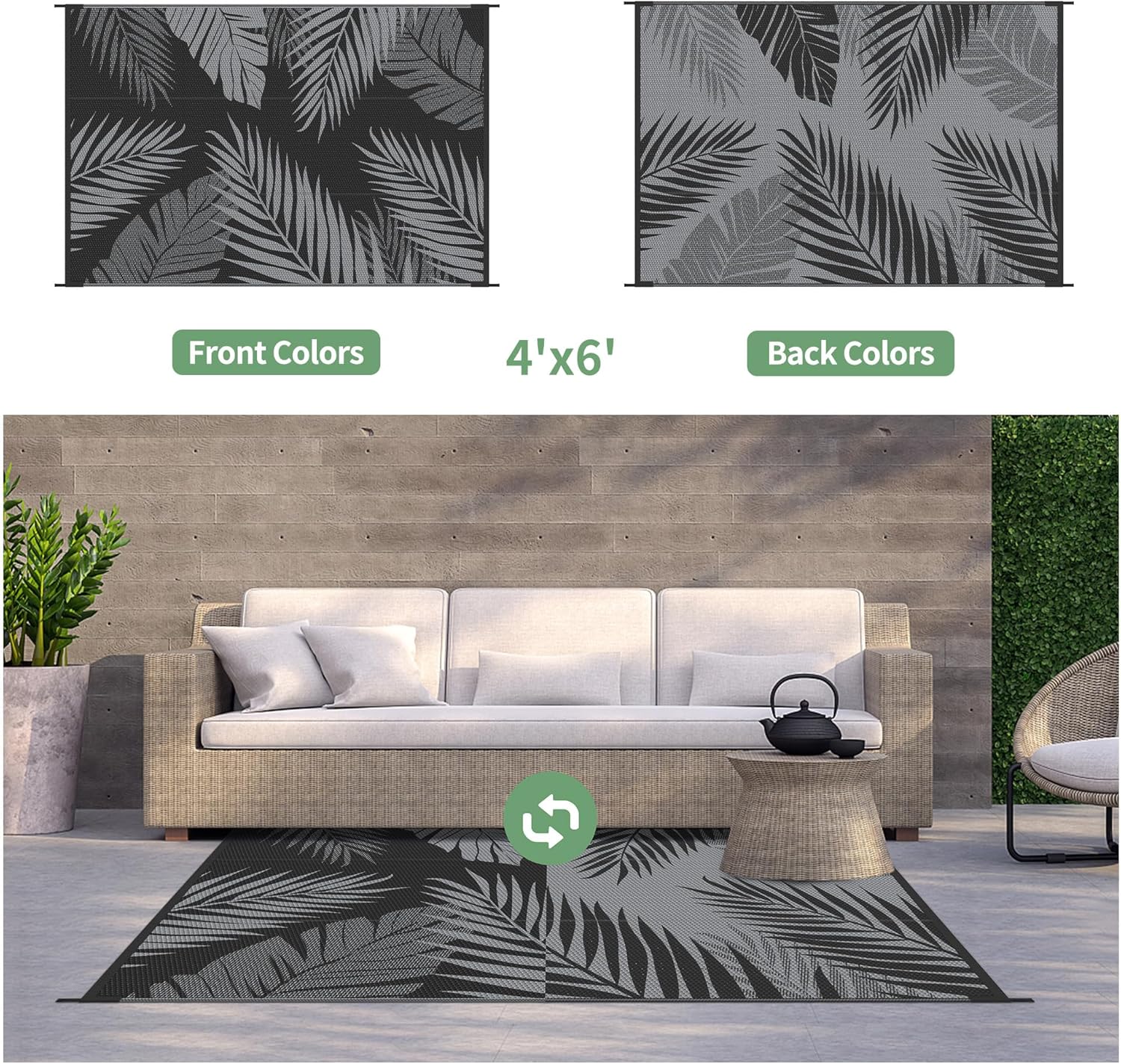 GENIMO Outdoor Rug 4' x 6' Waterproof for Patios Clearance, Reversible Outdoor Plastic Straw Camping Rug Carpet, Large Area Rugs Mats for RV, Camper, Deck, Balcony, Porch, Beach, Picnic, Black&Grey