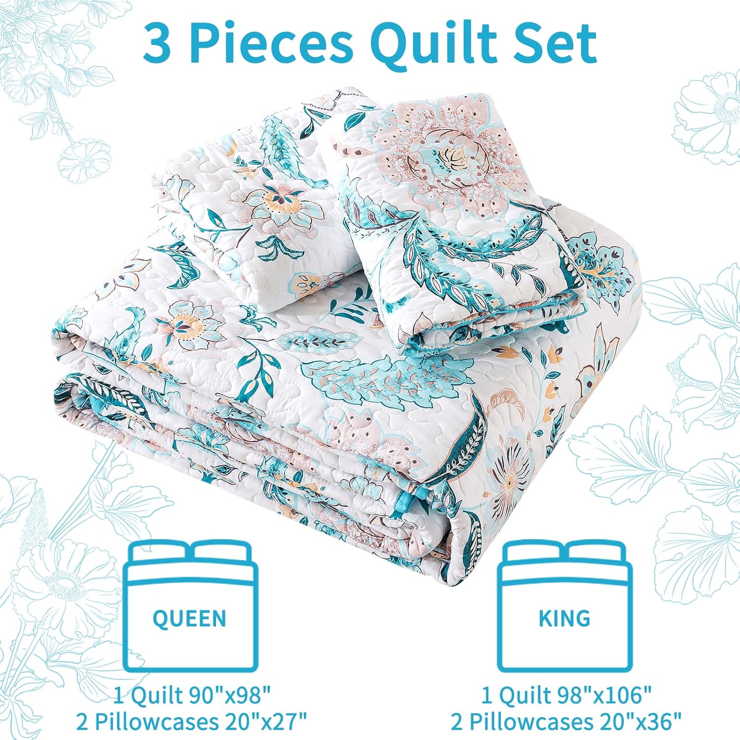 - [Sleep in Style] Chic quilt bedding set includes a queen size quilt (90* 98 in) and two pillow shams (20* 27+ 2 in) each. The exquisite stitching and range of bright colors add a pop of elegance to the bedroom. Opt for a larger size if prefer a fuller, more draping effect.