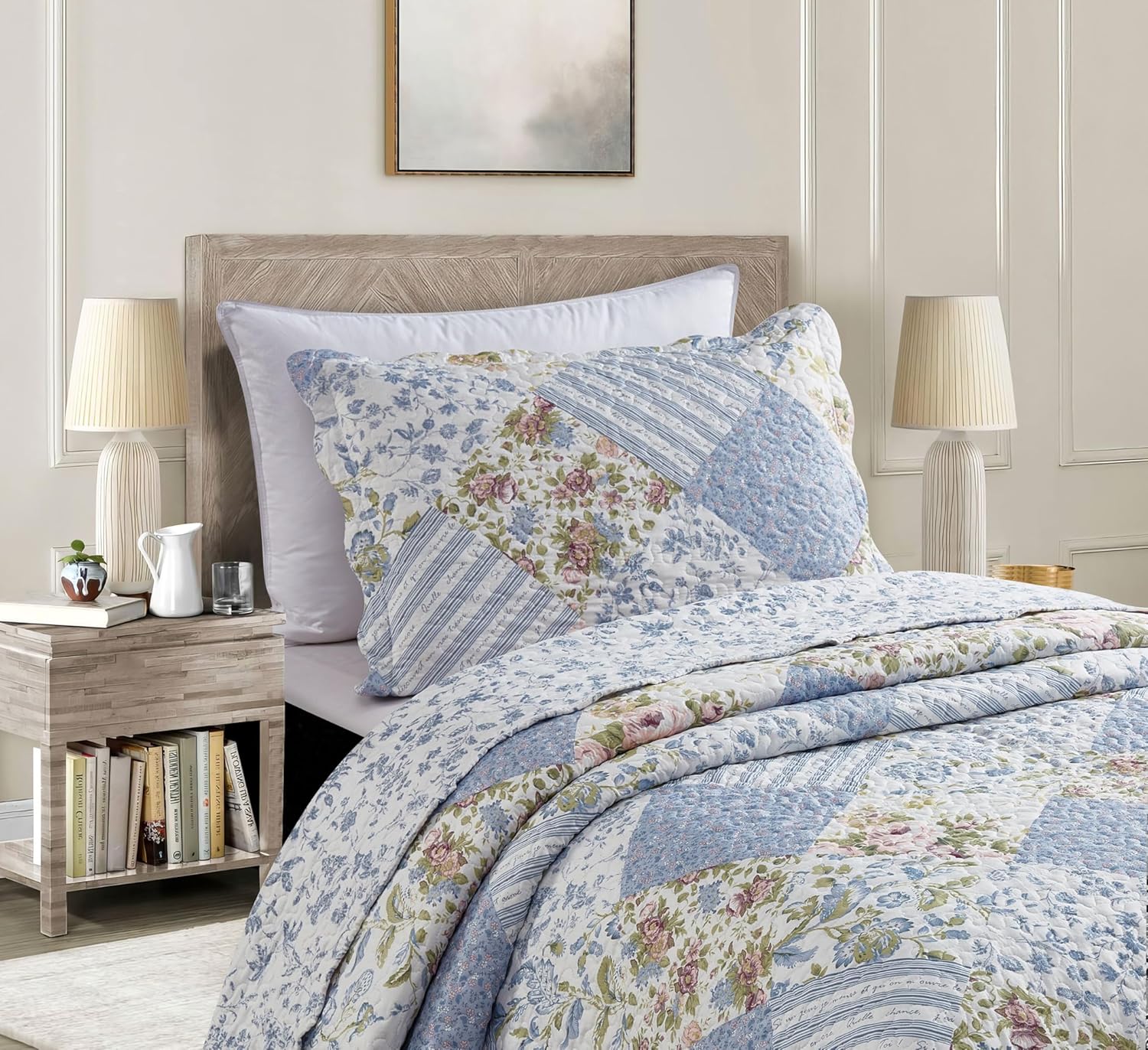 - UNIQUE DESIGN: Blue rose patchwork patterns, with vermicelli quilting, graceful, charming and unique. Reverse to a coordinating blue rose toile pattern. Made to enhance decor.