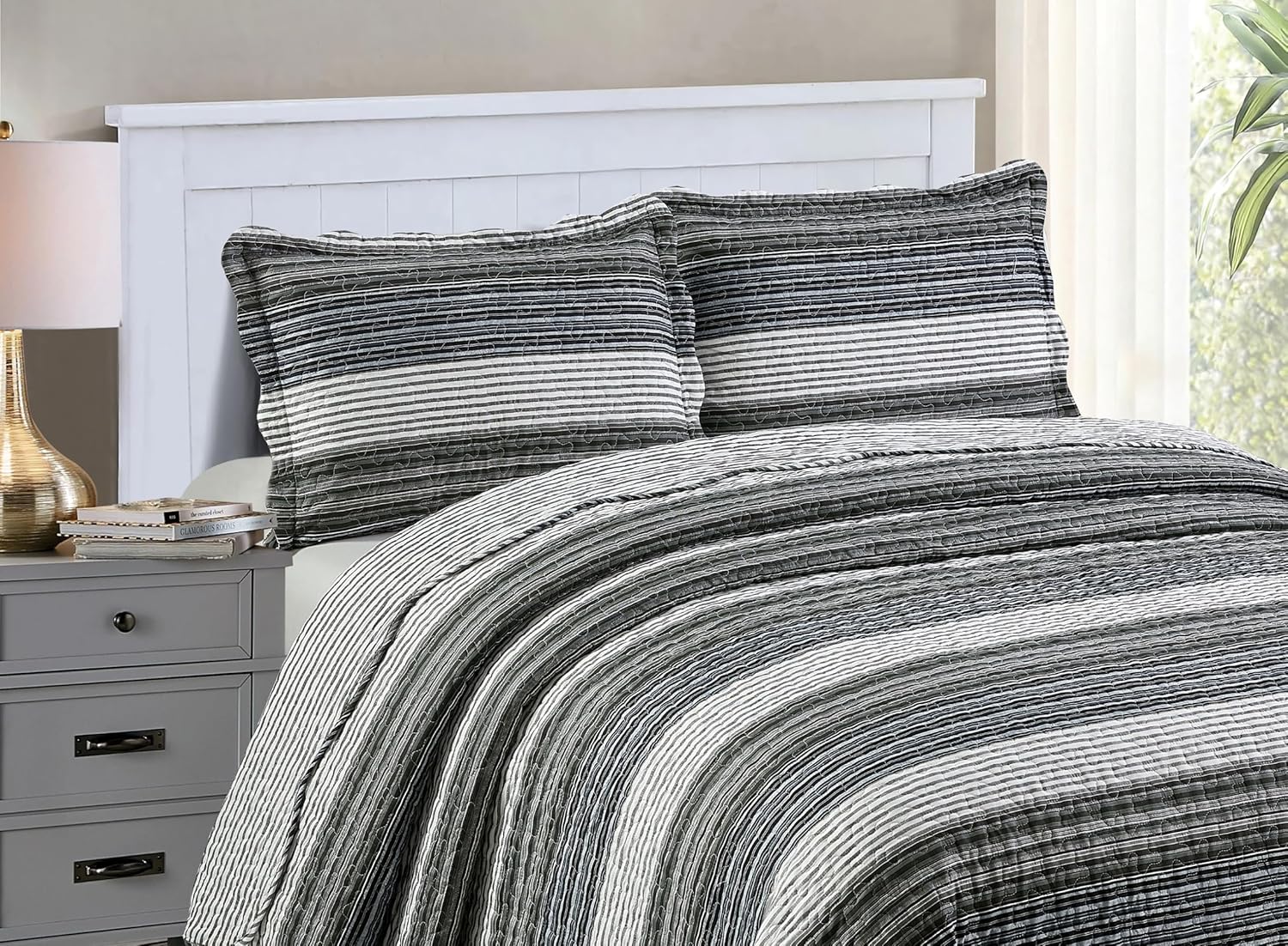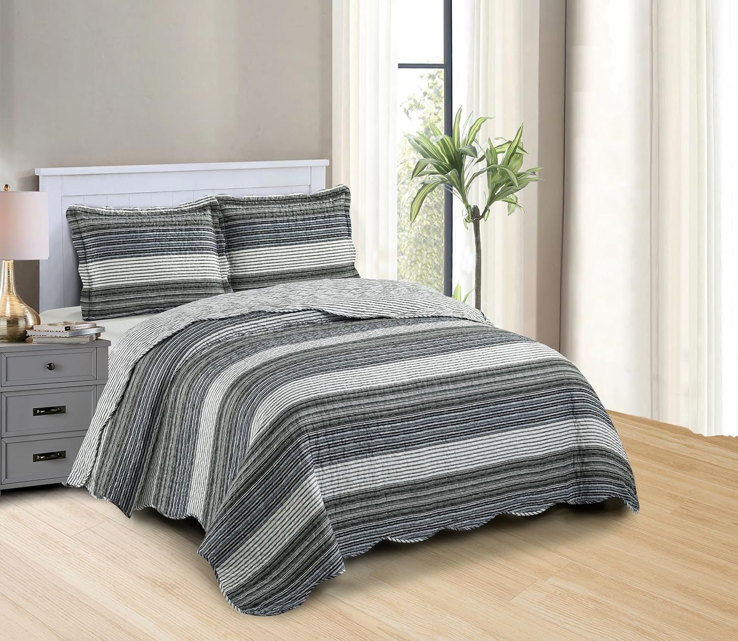 Brilliant Sunshine Multi Grey Stripes Patchwork, 3-Piece Quilt Set with 2 Shams, Reversible Bedspread, Soft Lightweight Coverlet, All-Season, Full/Queen, Multi Grey
