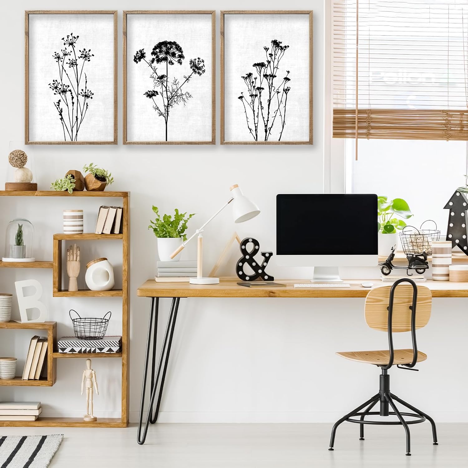 Flower Plant Wall Art Decor 16"x11" Set of 3 Black And White Botanical Painting Wood Framed For Minimalist Bedroom Office Rustic Living Room Abstract Wildflower Sign Hanging (Wood White)