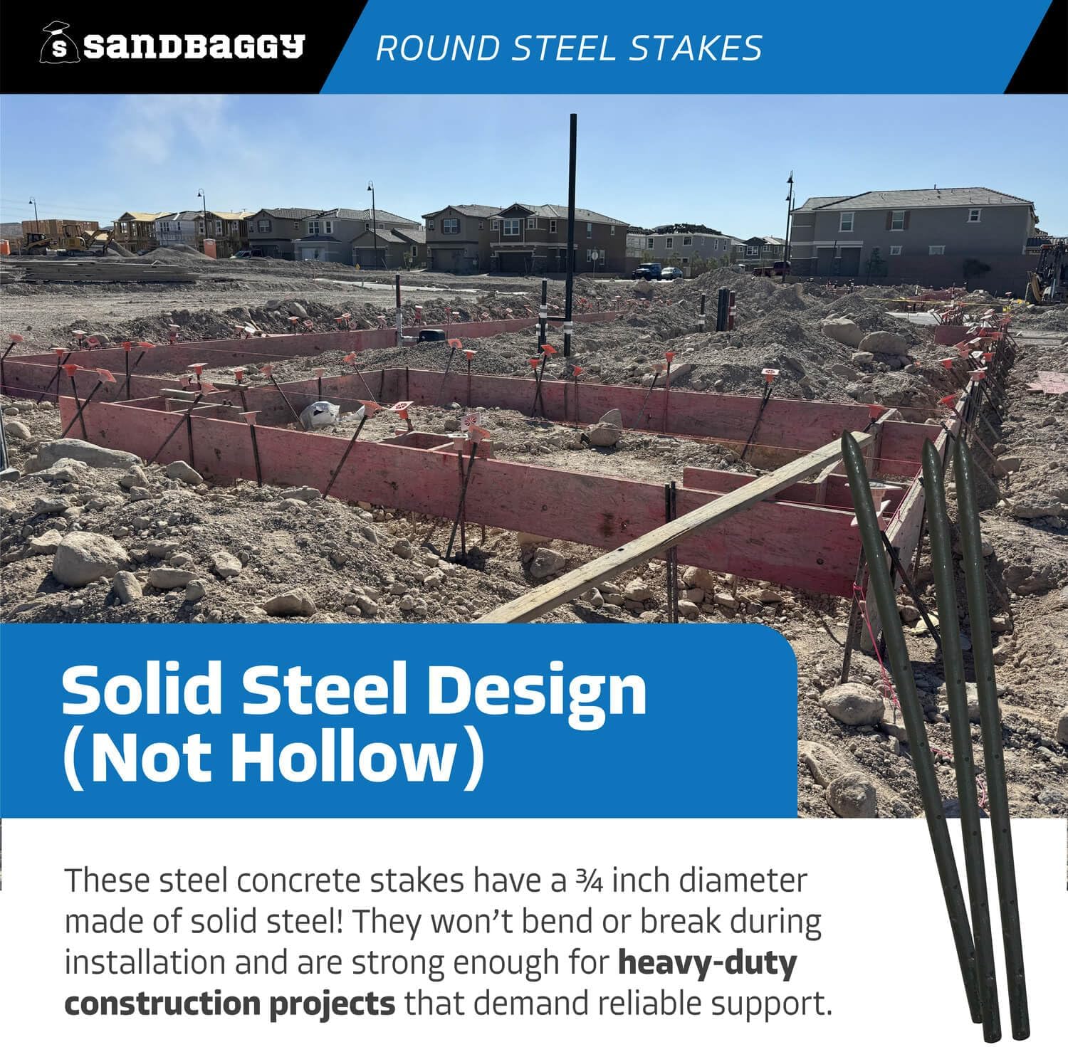 - SOLID STEEL DESIGN (NOT HOLLOW): These steel concrete stakes have a ¾ inch diameter made of solid steel! They won’t bend or break during installation and are strong enough for heavy-duty construction projects that demand reliable support.